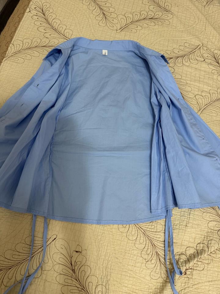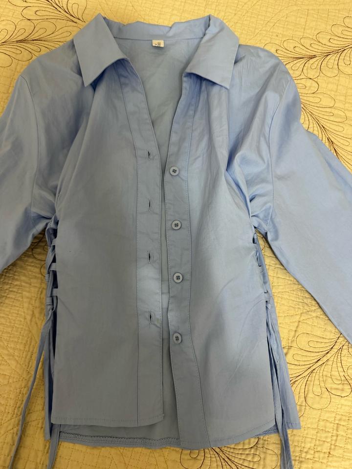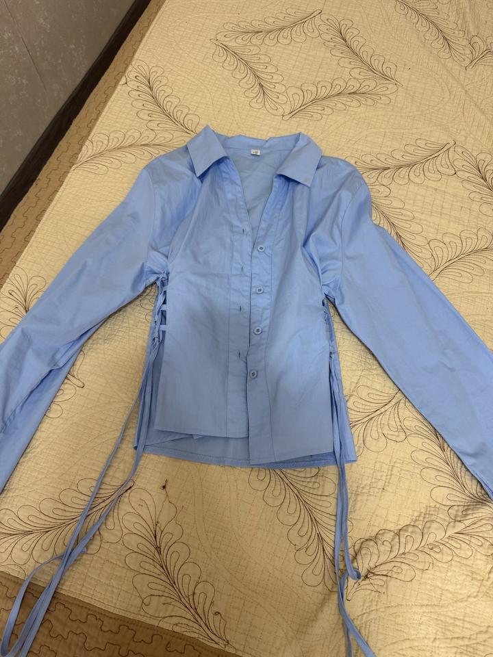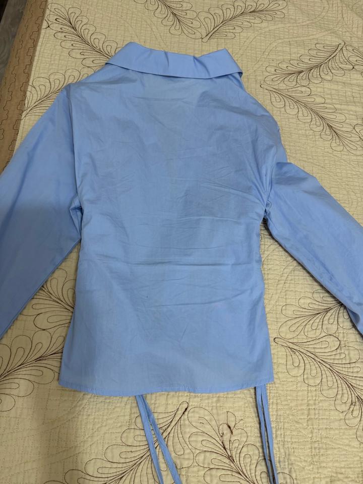 Голубая рубашка очень красивого и приятного цвета с завязками на талии с двух сторон,классно подчеркивает талию,брала с шоурума в Алмате,носила пару раз Подойдет на размер S,M Артикул: 517576