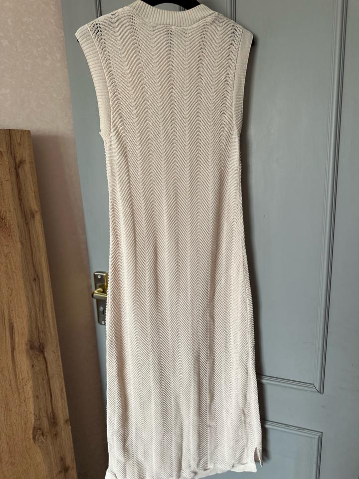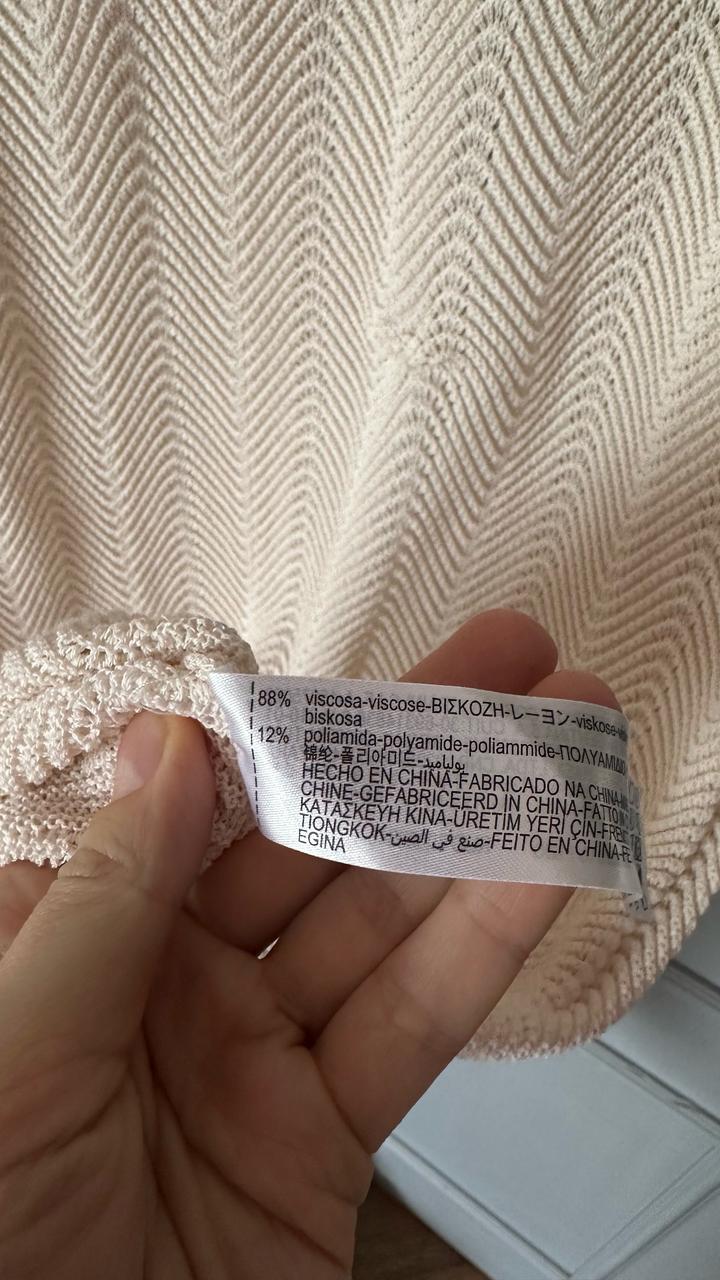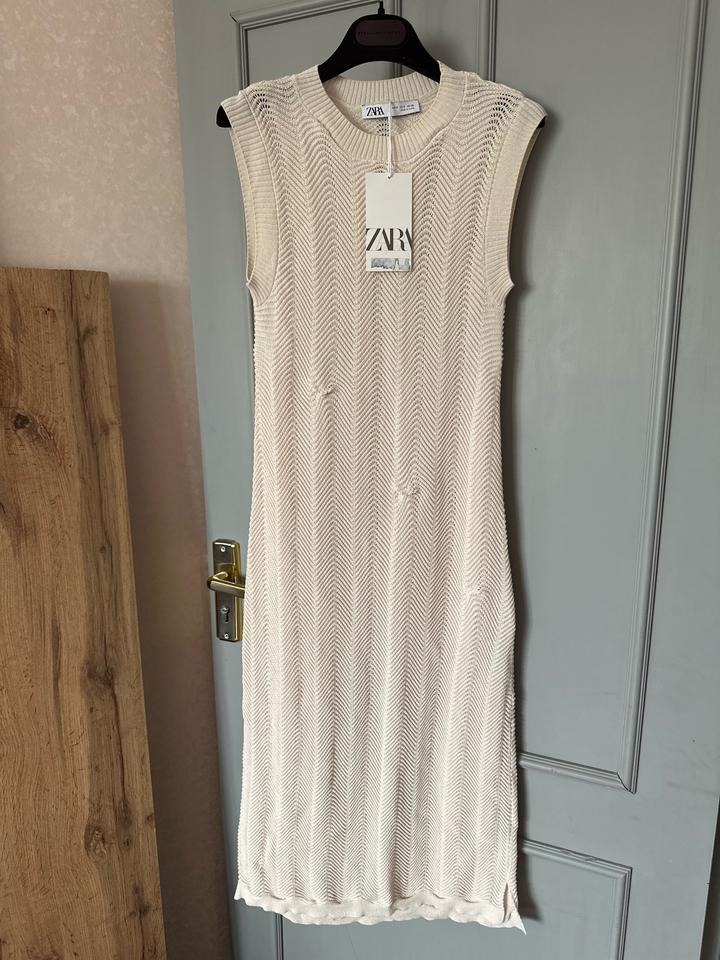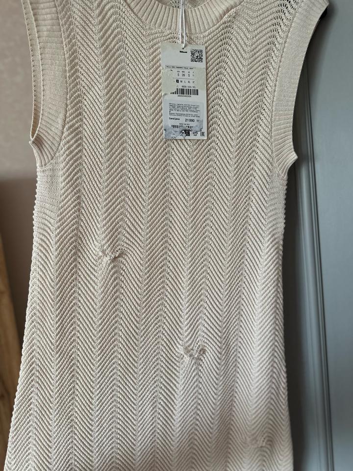 Стильное вязаное платье Zara в нежном кремовом оттенке 🤍 Модель без рукавов, с круглым вырезом и красивой фактурной вязкой «ёлочкой», которая визуально вытягивает силуэт. Прямой крой, длина миди — смотрится минималистично и дорого. Идеально для базового гардероба: можно носить как самостоятельное платье или сочетать с жакетом, рубашкой или ремнём. Отличный вариант на весну и лето 🌿 Артикул: 517647