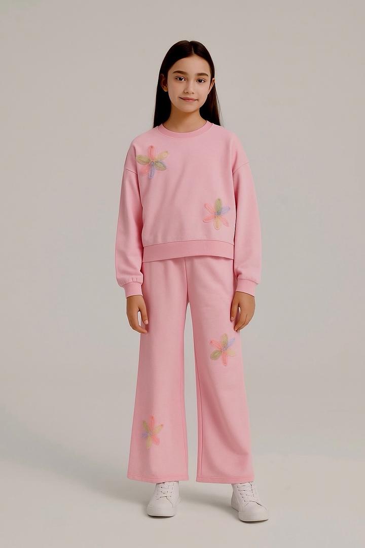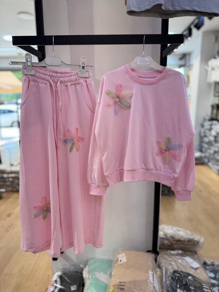 Двойка для девочек из двунитки с 3Д цветочками. Брюки расклешенные кюлоты, на резинке. Вверх толстовка, удобный и практичный. Размер 128 на 8 лет Артикул: 517968