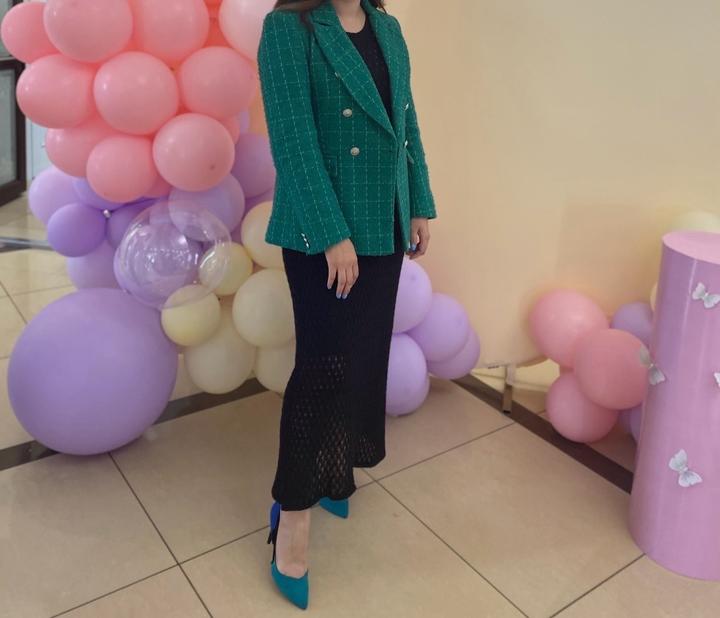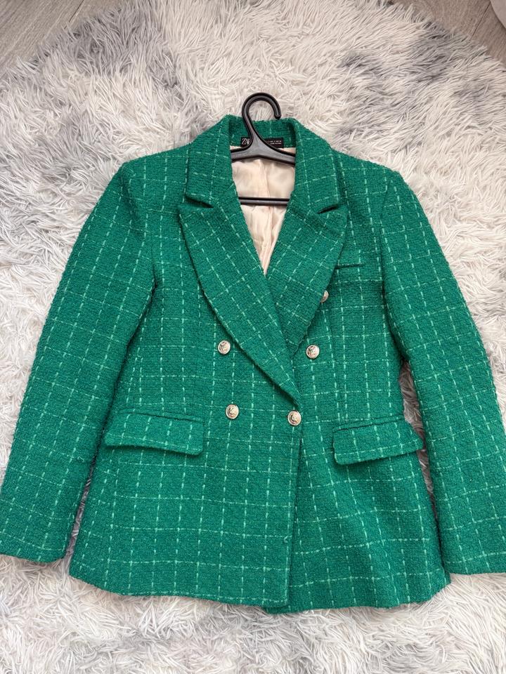 Двубортный блейзер насыщенного изумрудного цвета. Плотный качественный твид на подкладке. Хорошо держит форму. Артикул: 518079