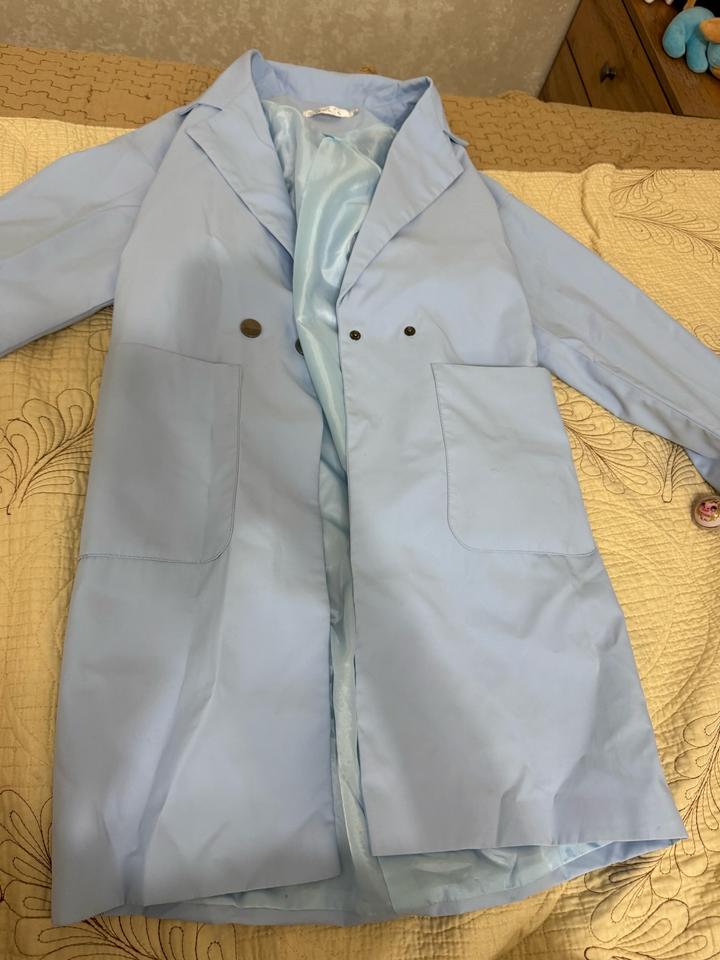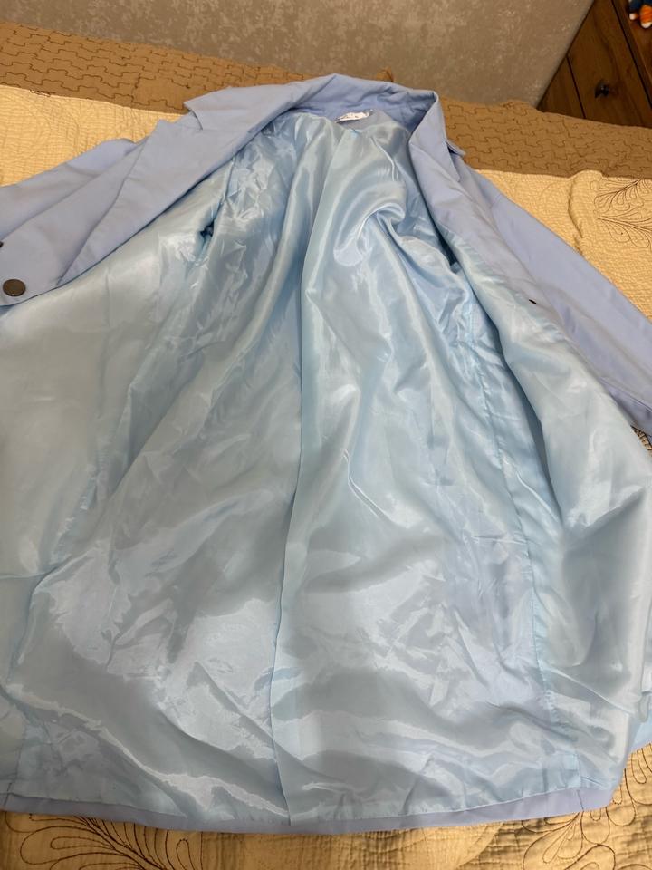 Голубой плащь приятного цвета,материал мягкий Есть маленькие незначительные пятна которые не заметны по этому цена сниженная Размер 42 Артикул: 518432
