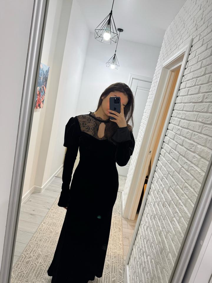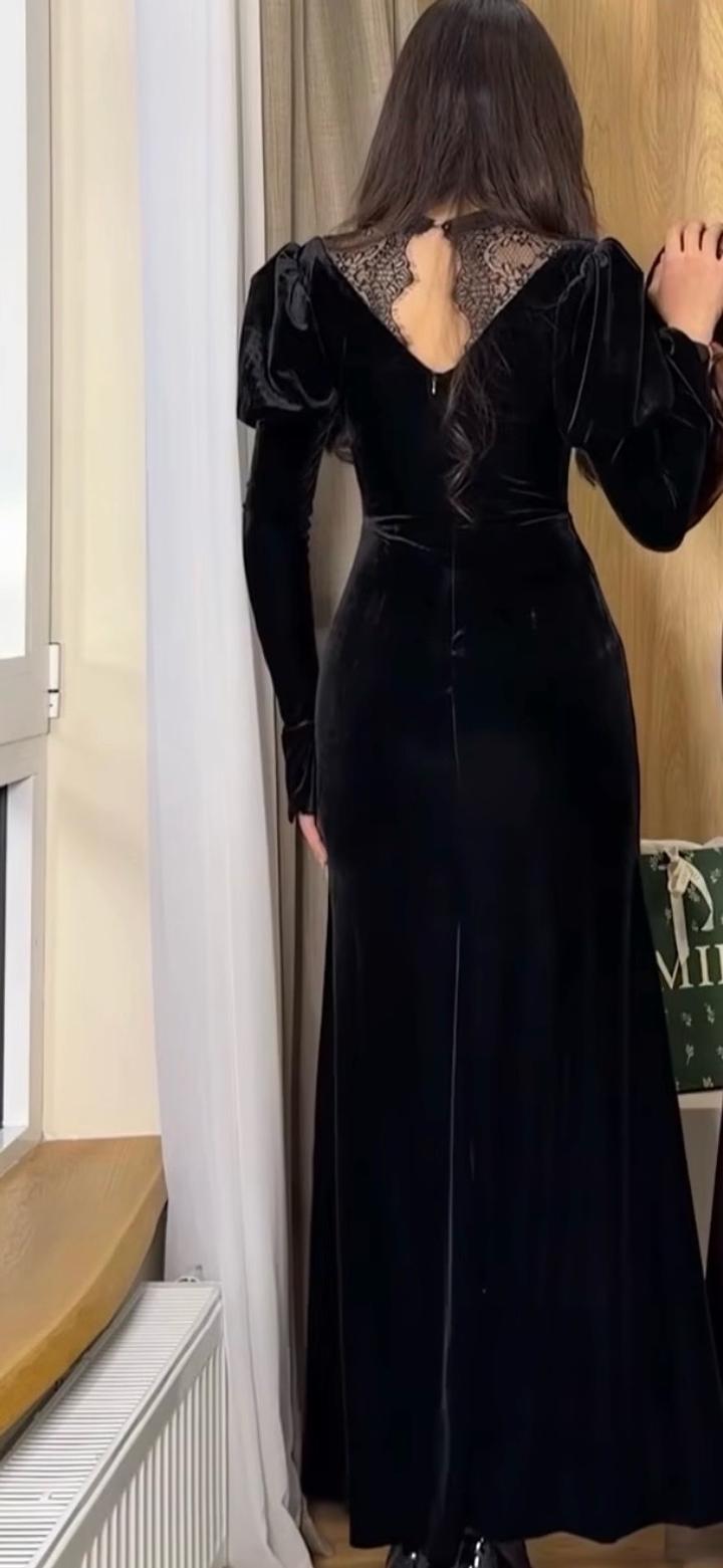 Черное длинное бархатное платье с кружевом. Размер М (44). Бархат визуально вытягивает силуэт и делает фигуру стройнее. Брала на выход, но ни разу не носила. Новое, без бирок. Сзади рабочий замок и пуговица возле шеи. Артикул: 518762