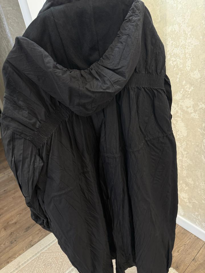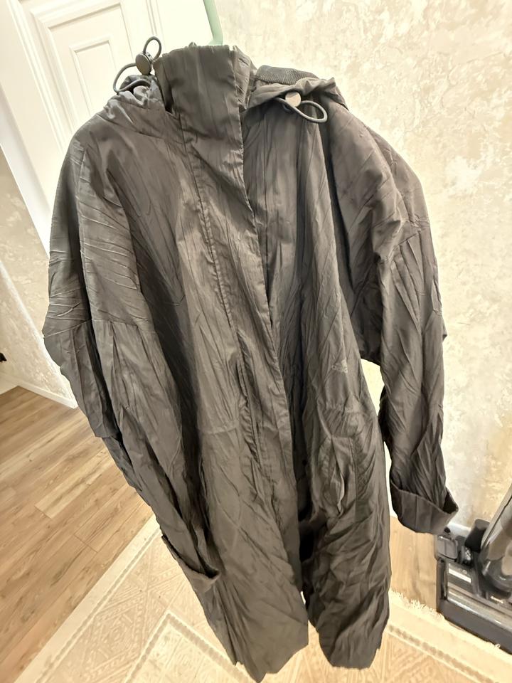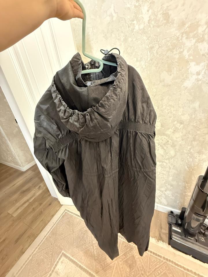 Практичный плащ для прохладной погоды. Фасон такой, что его не приходится гладить и переживать по поводу складок после поездки в автобусе. Ткань плотная, не продувается ветром и хорошо защищает от дождя. Сама носила из-за удобного фасона во время беременности. Размер от 46 до 52 размера подойдет Артикул: 518839