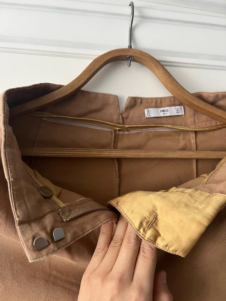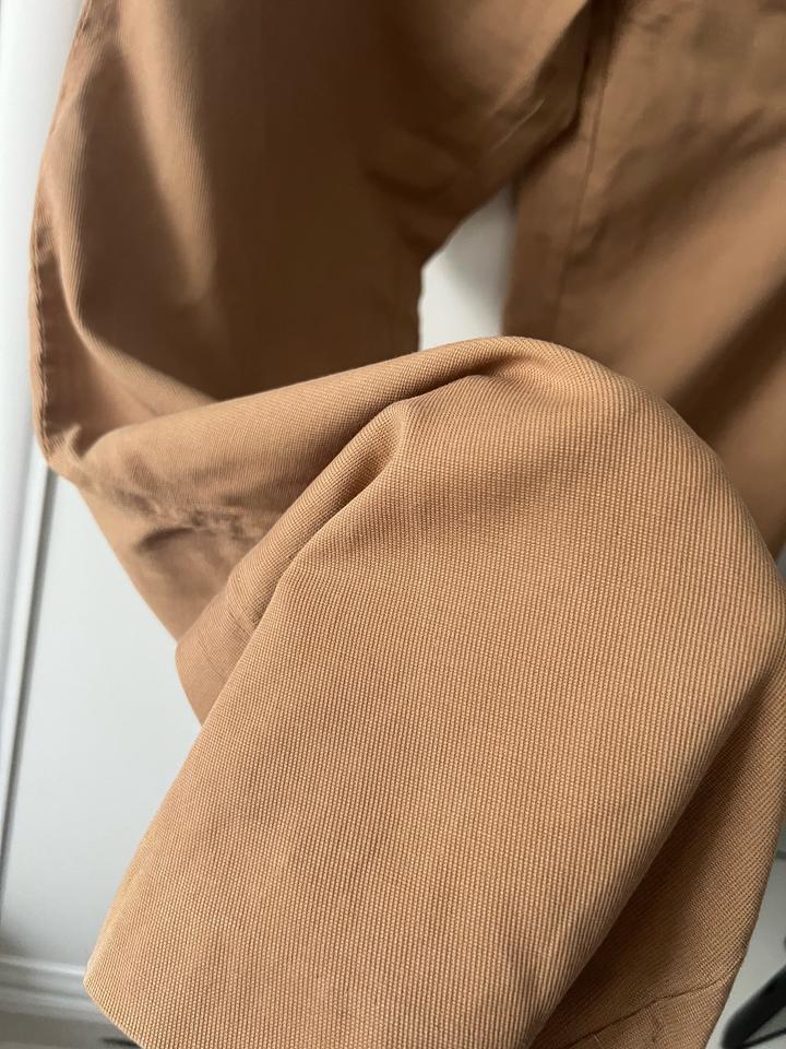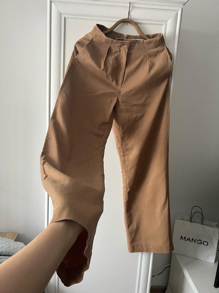 На высокой посадке брюки, материал как хлопок. Красивый желтый цвет, переходящий на бежевый. Но больше как желтый смотрится в жизни, как цвет охра. Размер S, но подойдет на М, так как высокая посадка. Артикул: 518886