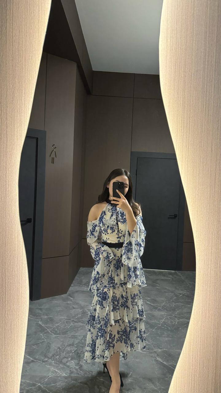 Лёгкое платье с открытыми плечами, цветочным принтом и многоярусной юбкой, подчеркнутое поясом. Артикул: 519050