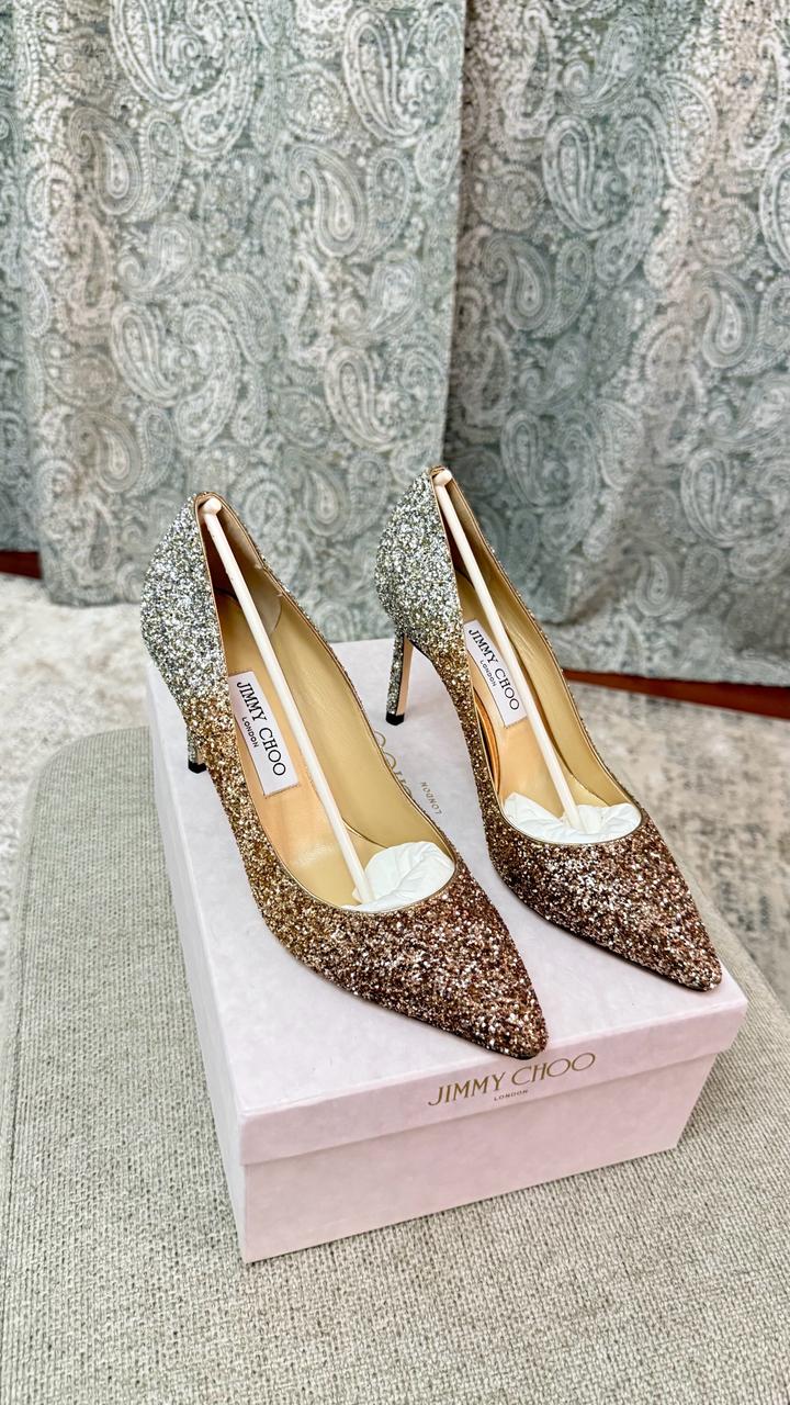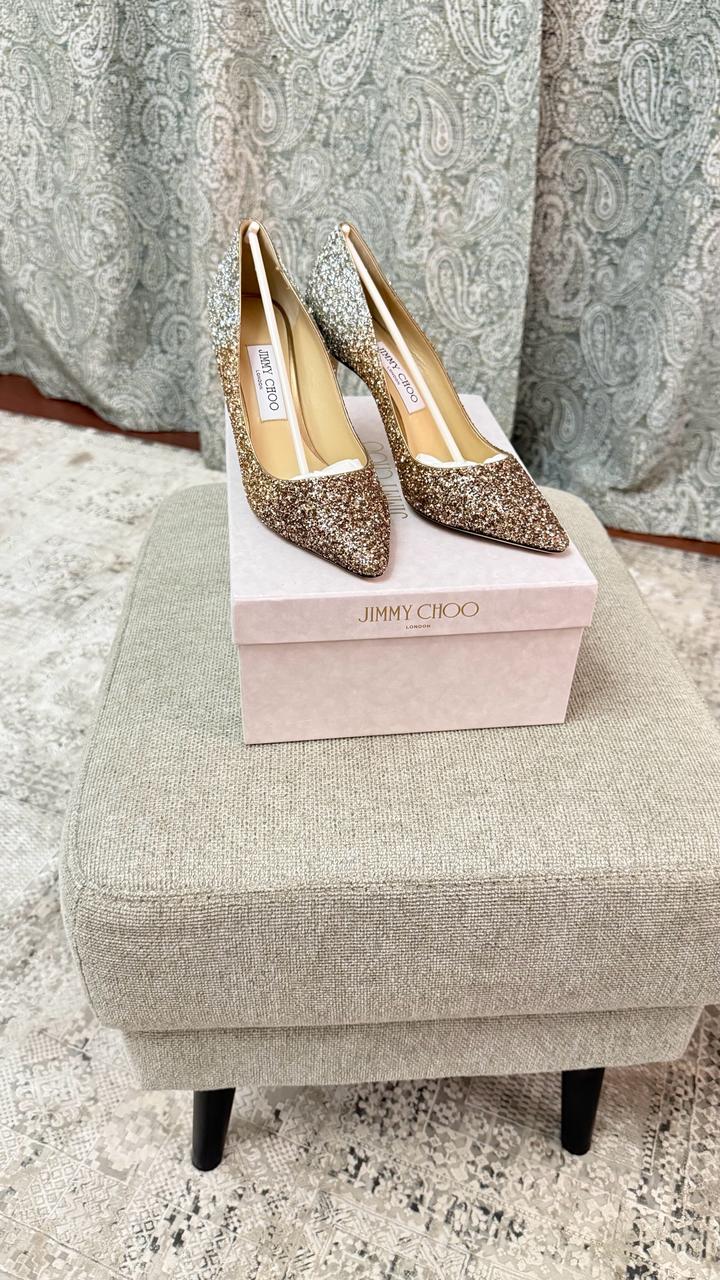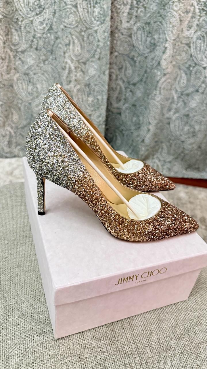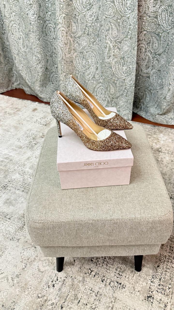 Продаю новые туфли Jimmy Choo London, ни разу не надевались. Размер 39. Модель — классические лодочки на шпильке с острым носком. Покрытие — глиттер с эффектом омбре: золото плавно переходит в серебро. Смотрятся роскошно — идеальный вариант для свадьбы, выхода или вечеринки. Артикул: 519181