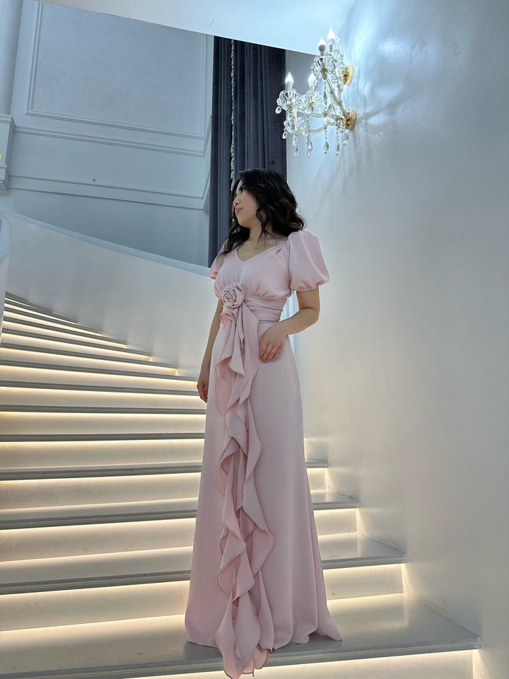 Длинное нежно-розовое платье с V-вырезом, объемными рукавами и драпировкой с розой спереди. Артикул: 519732