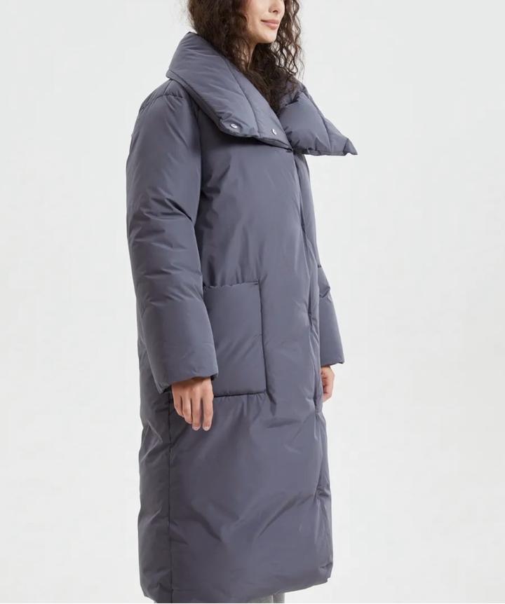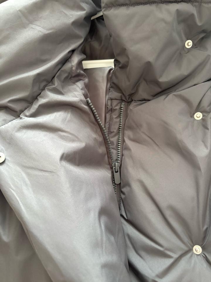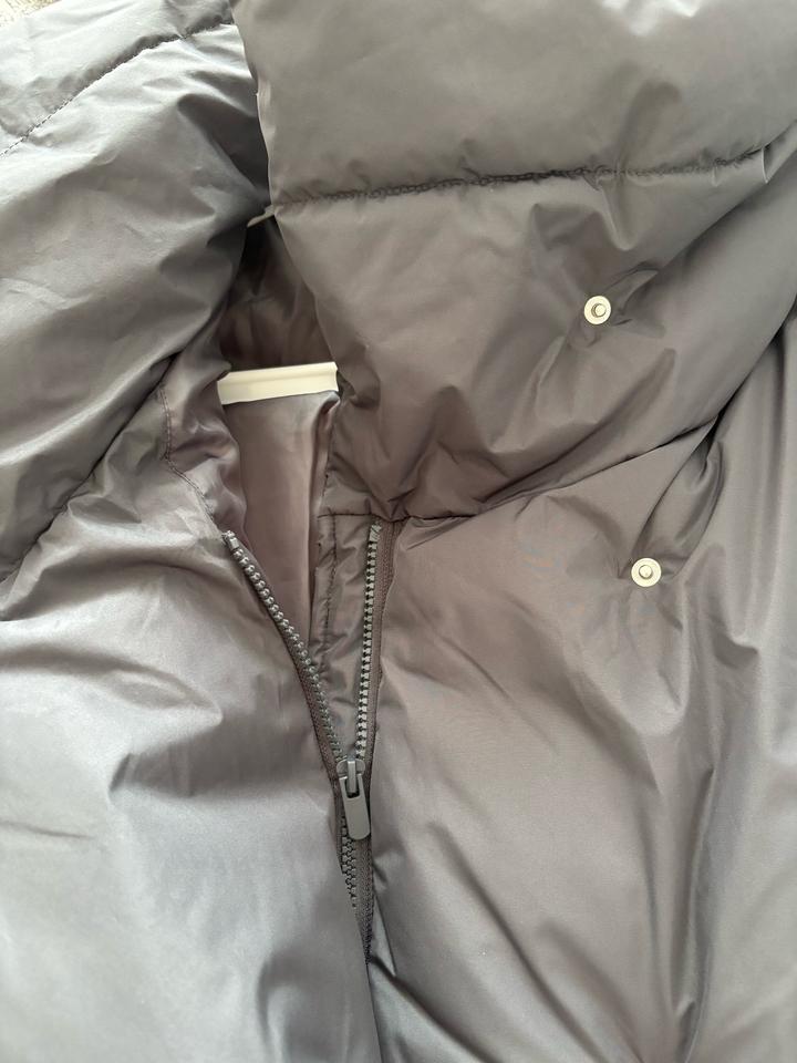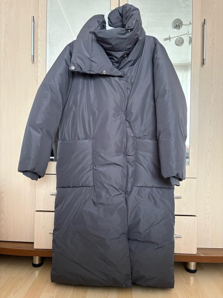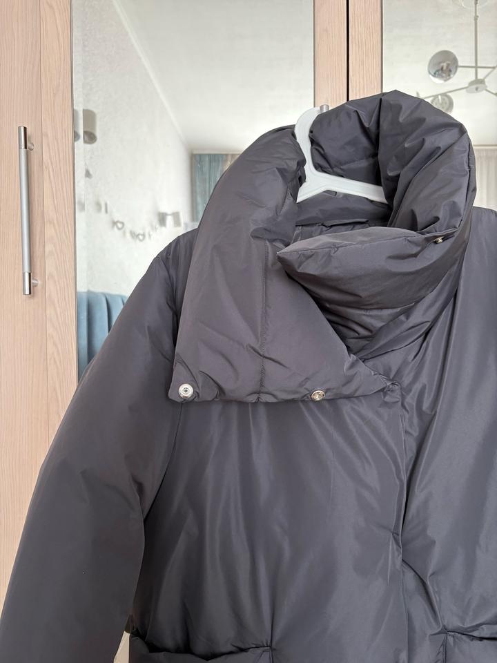 Пуховик красивого графитового цвета, прямого силуэта в минималистичном дизайне, с высоким воротом, трикотажными манжетами, очень плотный и теплый. Застегивается на молнию и кнопки. Надет пару раз, в идеальном состоянии. Будет лучше на рост выше 160. Артикул: 519854