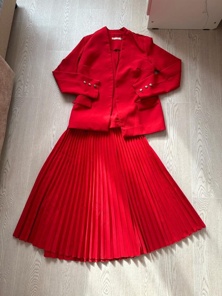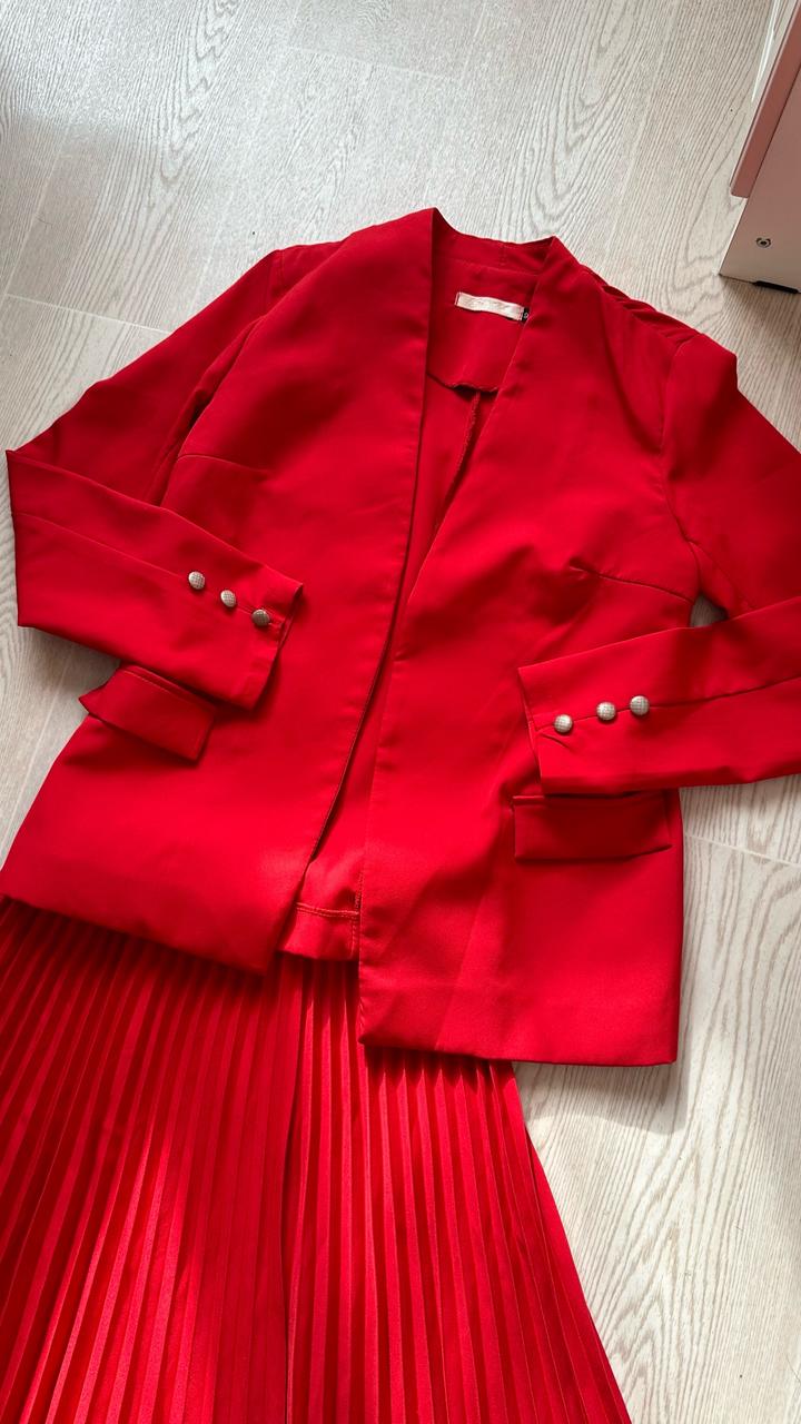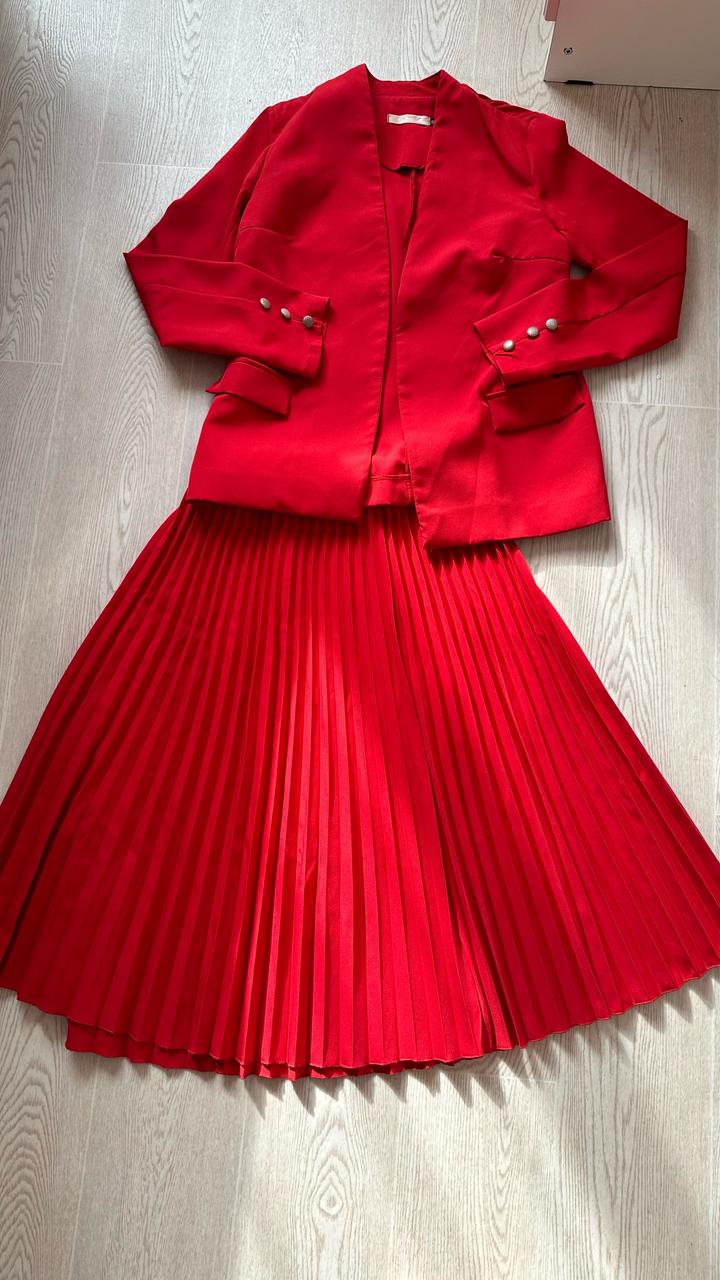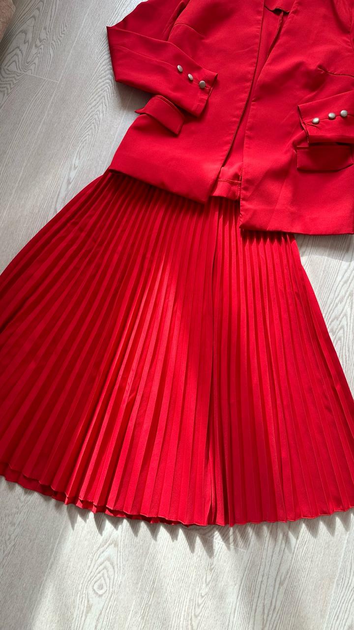 Костюм двойка в красном цвете. Юбка плиссе и пиджачок без пуговиц. Артикул: 519871