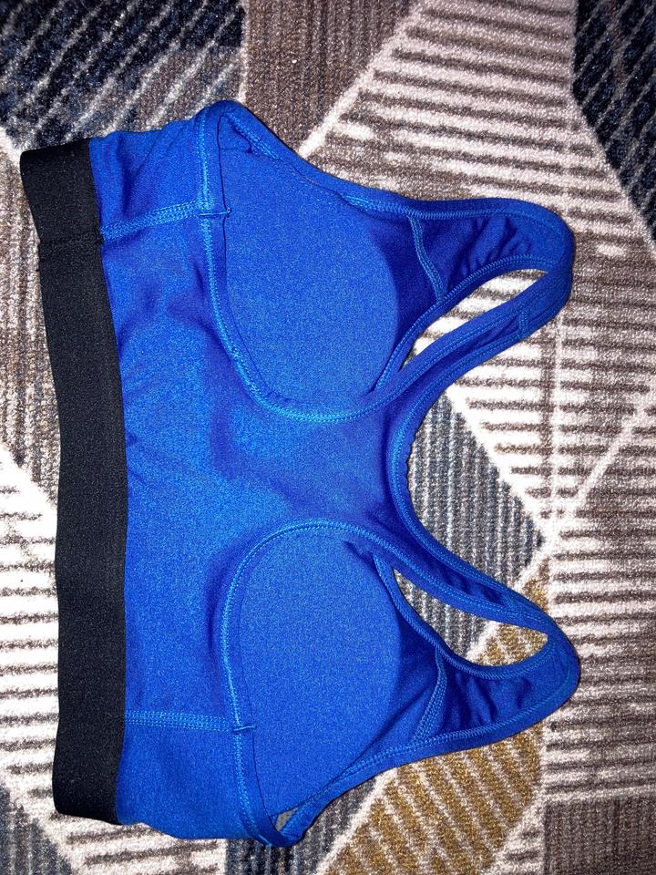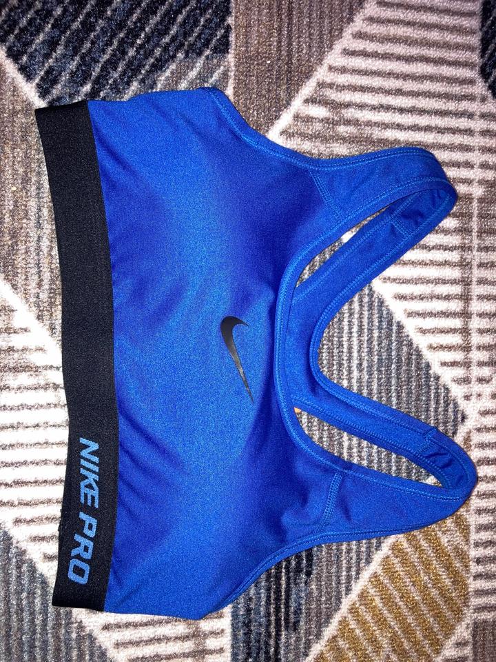 Тип: спортивный топ / бра s размера Цвет: ярко-синий (electric blue) с чёрной резинкой Логотип: фирменный «swoosh» спереди Бретели: борцовская спинка (racerback) — удобно для тренировок Посадка: облегающая, хорошо фиксирует грудь. Не подошел размер Артикул: 519926