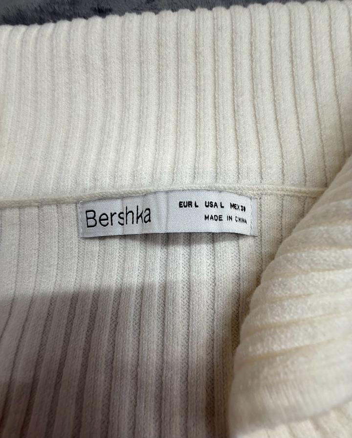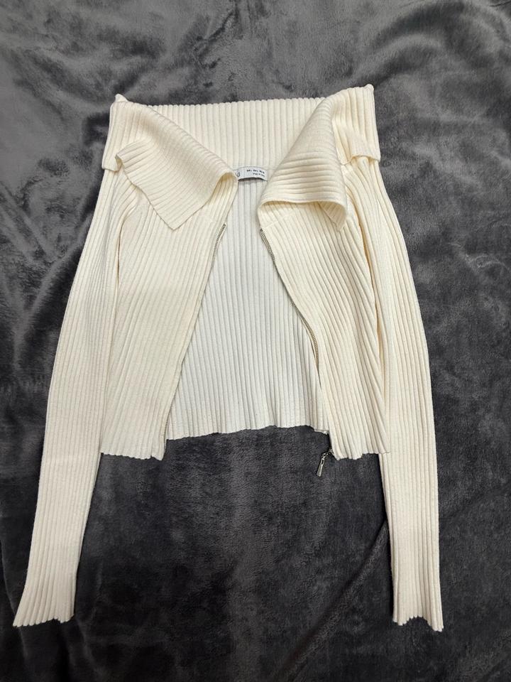 Белая шерстянная кофта Bershka на замке с голыми плечами. Размер L. Есть катышки. Артикул: 520544