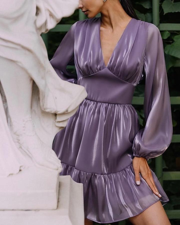 Сиреневое сатиновое мини-платье с глубоким V-вырезом, длинными объемными рукавами и лёгкой расклешённой юбкой с воланом. Артикул: 520548