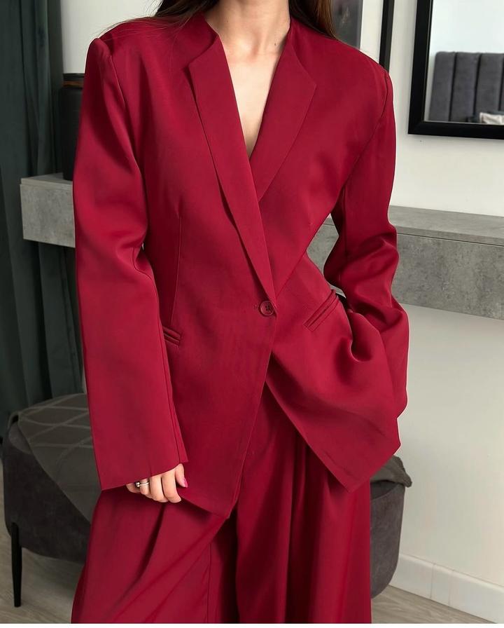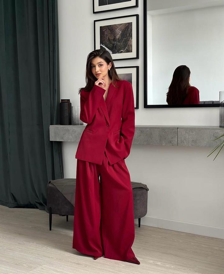 Эффектный брючный костюм в насыщенном красном цвете — идеальный выбор для стильных и уверенных в себе девушек. Комплект состоит из удлинённого пиджака свободного кроя и широких брюк, создающих элегантный и вытянутый силуэт. Артикул: 520808