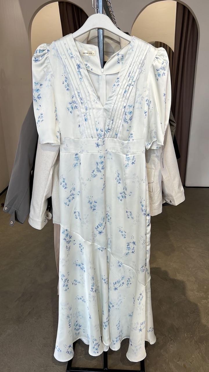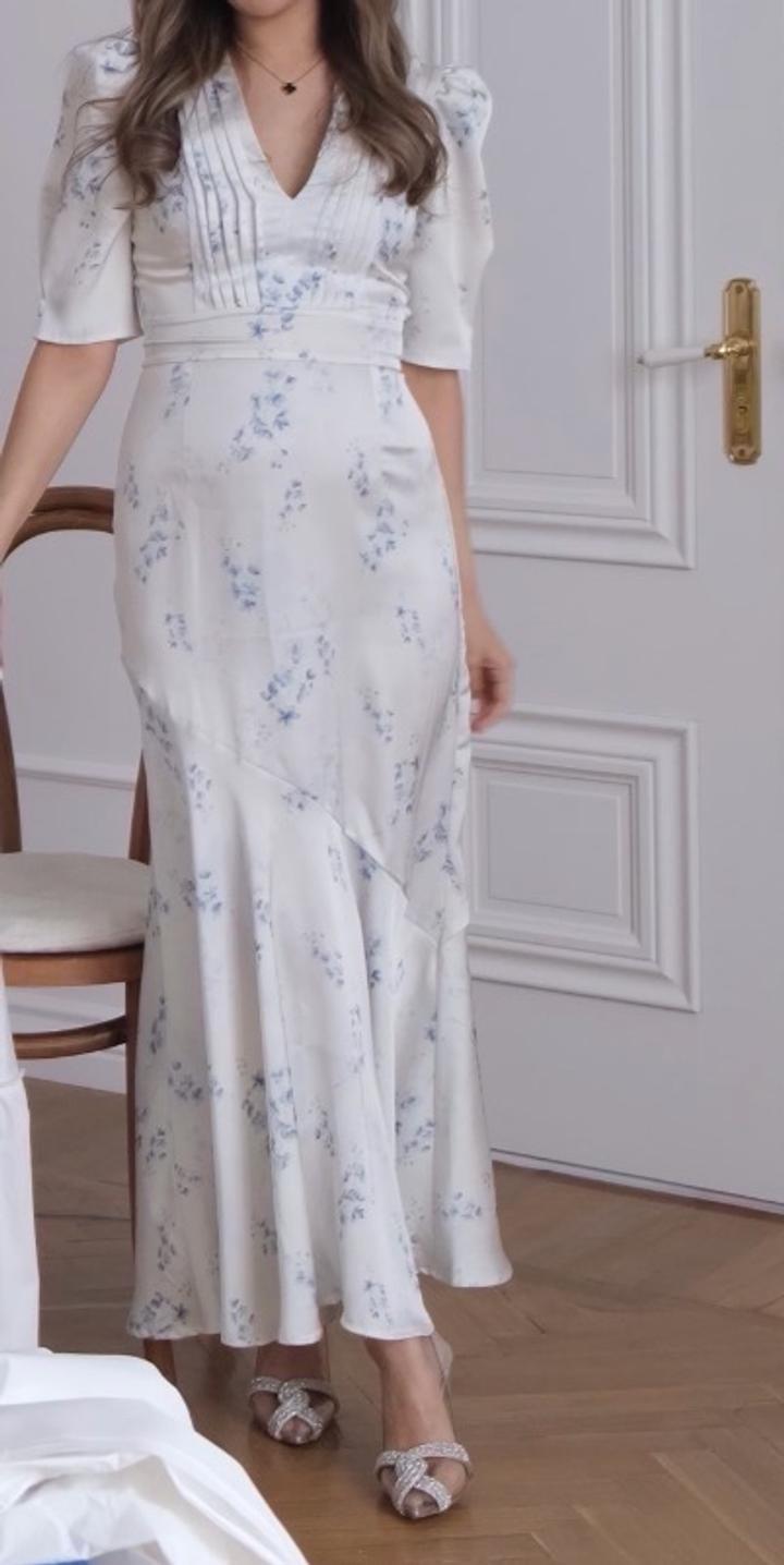 Платье белое атласное с голубыми мелкими цветочками,надевалось один раз,как новое. Размер S,подойдёт беременяшкам. Артикул: 520881