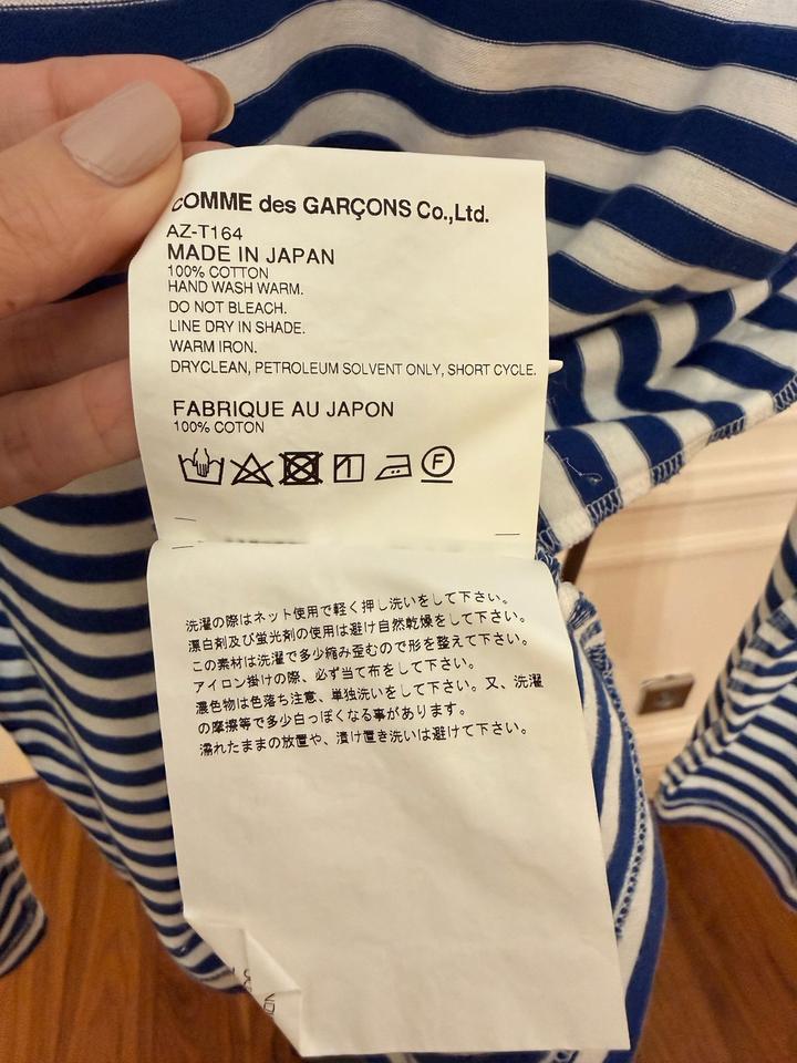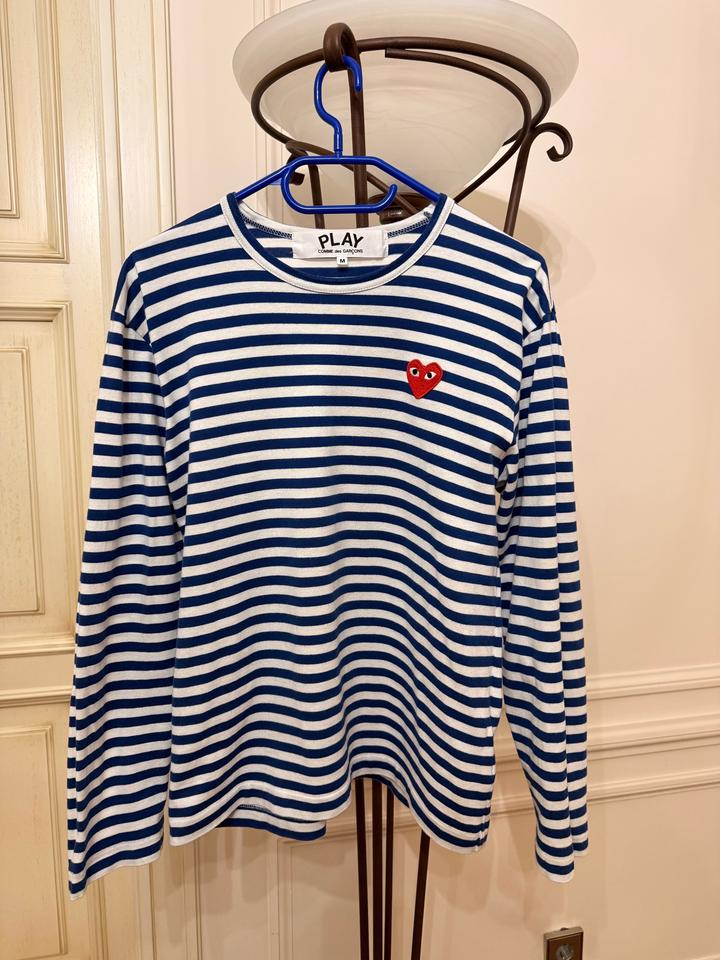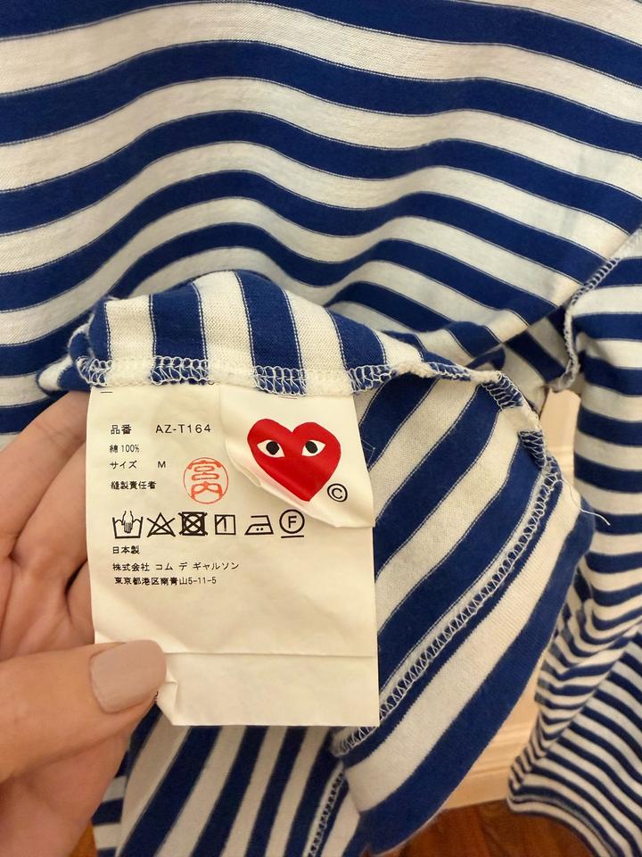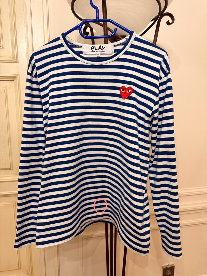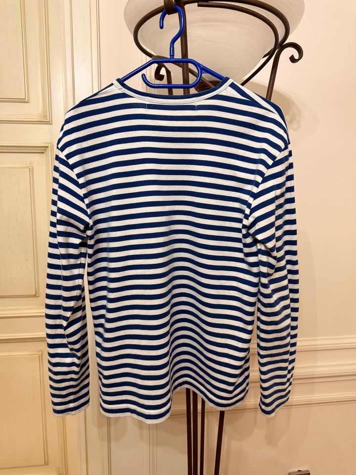 Стильная тельняшка лонгслив Comme des Garçons Play Размер М (маломерит)- подойдет на S-M, в зависимости от предпочитаемой посадки. Оригинал. Классическая модель с полосками и логотипом с сердцем. Длина 60 см Грудь ( От подмышки до подмышки) 48 см Длина рукава 60 см Были маленькие дырочки, которые зашили. Не сильно заметно (см последние 3 фото) В целом, нормальное состояние, вещь носили и стирали несколько раз. Артикул: 521016