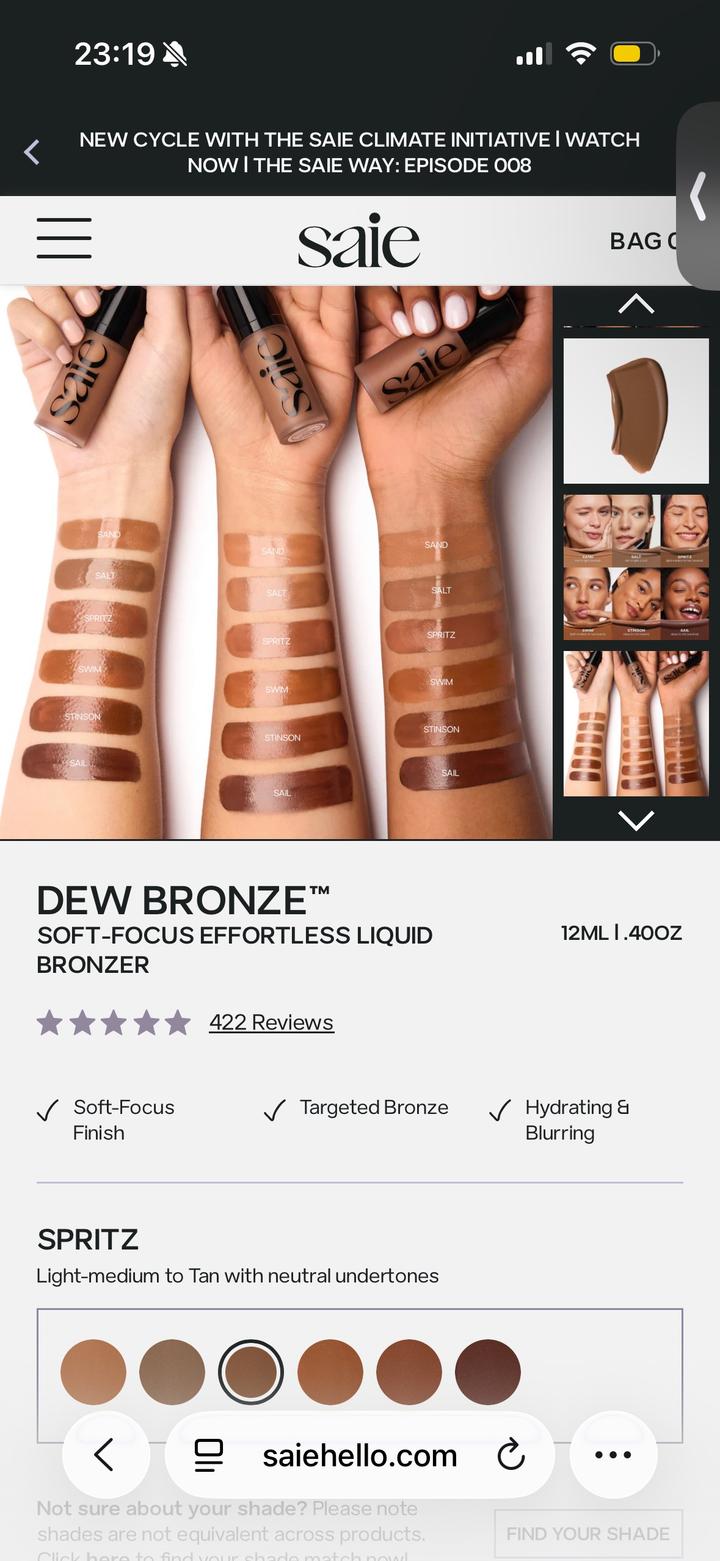 Брала в Сефоре в Дубае не подошел оттенок, положу пробник базу под макияж сияющую Roseglow 5 мл Saie Dew Bronze Soft-Focus Effortless Liquid Bronzer – это лёгкий жидкий бронзер, создающий эффект естественного загара и мягкого сияния. Его шелковистая текстура равномерно распределяется по коже, придавая лицу свежий и отдохнувший вид. Формула с ухаживающими компонентами легко растушёвывается и подходит для разных типов кожи. Артикул: 521284