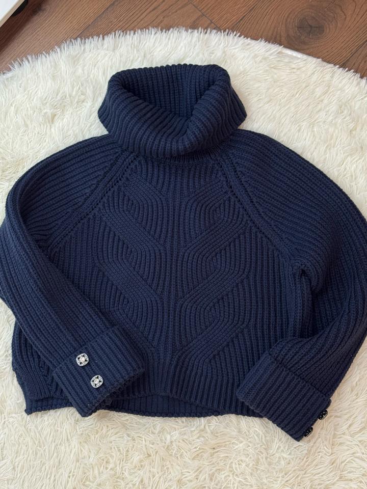 Фасон: укороченный, свободный крой (оверсайз), с немного объёмными рукавами Ворот: высокий, мягкий гольф (turtleneck), можно подворачивать. Рукава: длинные, с манжетами Детали: на манжетах декоративные металлические пуговицы Низ: слегка укороченный, с аккуратной резинкой Артикул: 521684