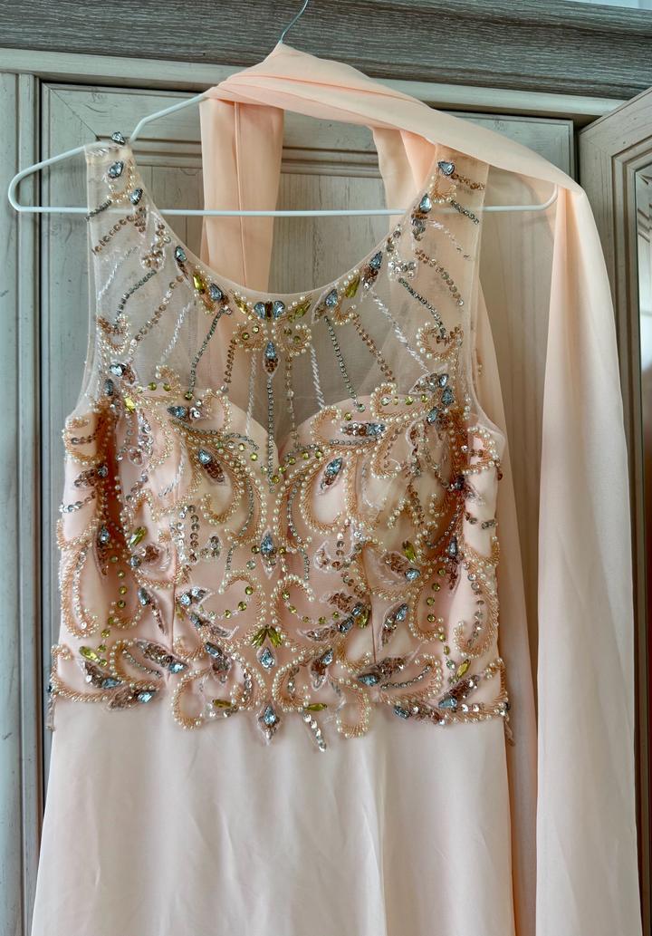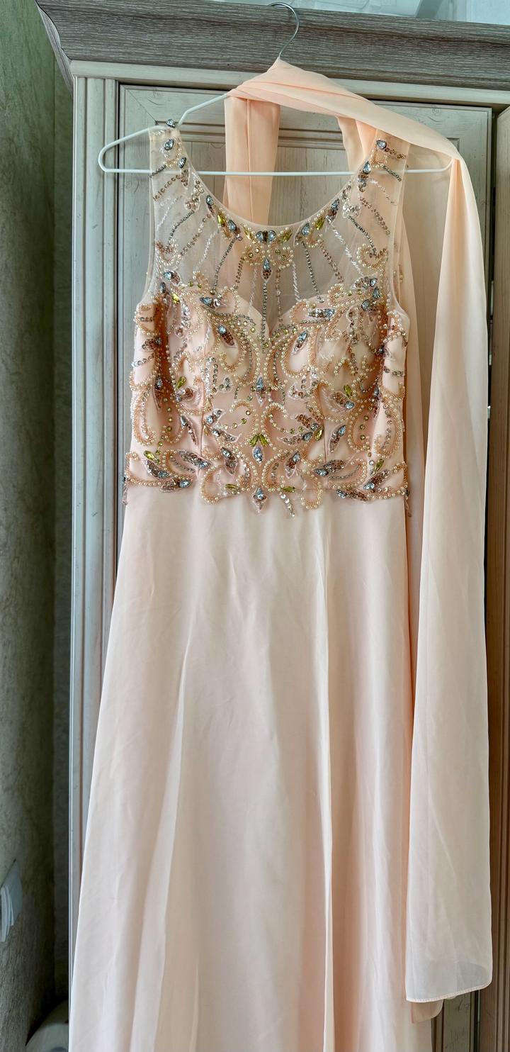 Вечернее платье в персиково-пудровом оттенке. Надевала 1 раз на свадьбу. После химчистки. Идеально подойдет на выпускной, свадьбу или любое торжество, где хочется выглядеть особенно. Вся вышивка (камни и бисер) на месте, без повреждений. Размер: S (42) Артикул: 521715