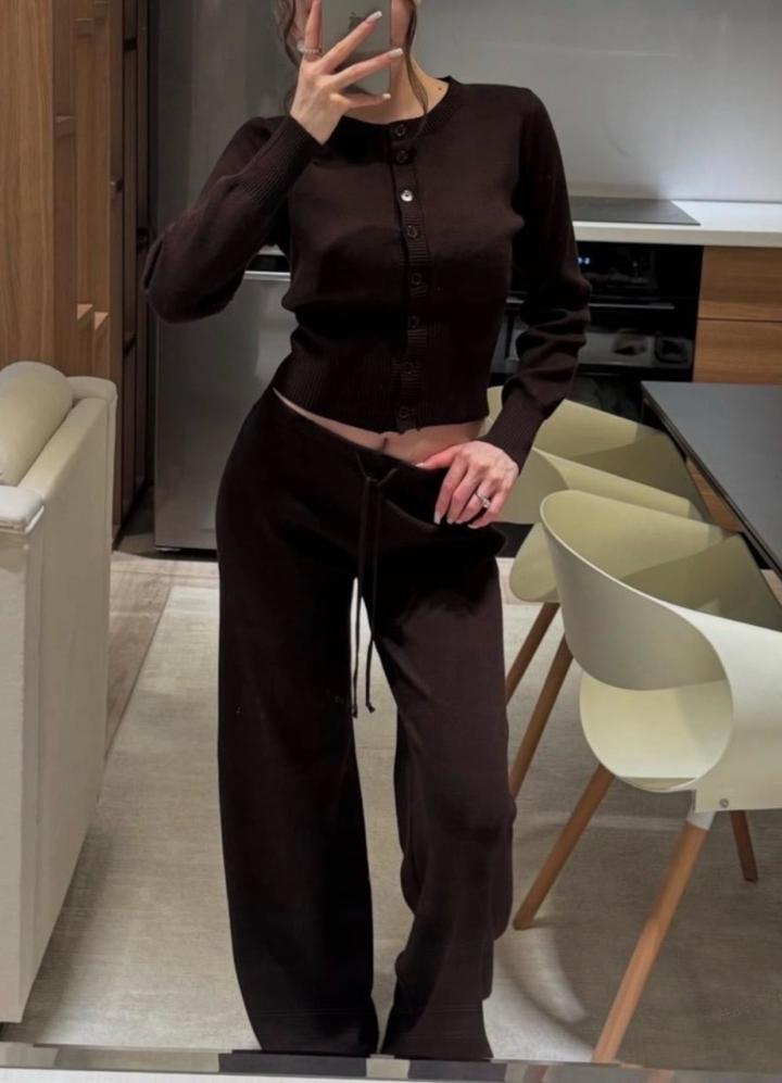 Состояние новой вещи, без нюансов Укороченный трикотажный кардиган (Топ): • Цвет: Глубокий шоколадно-коричневый (Chocolate Brown). Это один из самых востребованных и «дорогих» оттенков сезона. • Фасон: Приталенный, укороченный крой. Такая длина акцентирует талию и создает актуальный силуэт Трикотажные брюки палаццо (Низ): • Цвет: Полностью совпадает по оттенку с кардиганом, создавая безупречный total-look. • Фасон: Широкие брюки-палаццо. Свободный крой обеспечивает комфорт и визуально удлиняет н Артикул: 522138