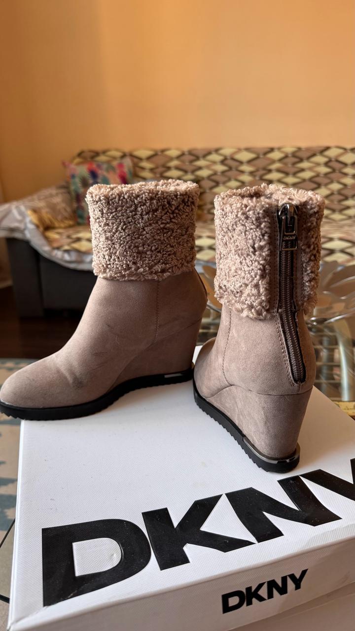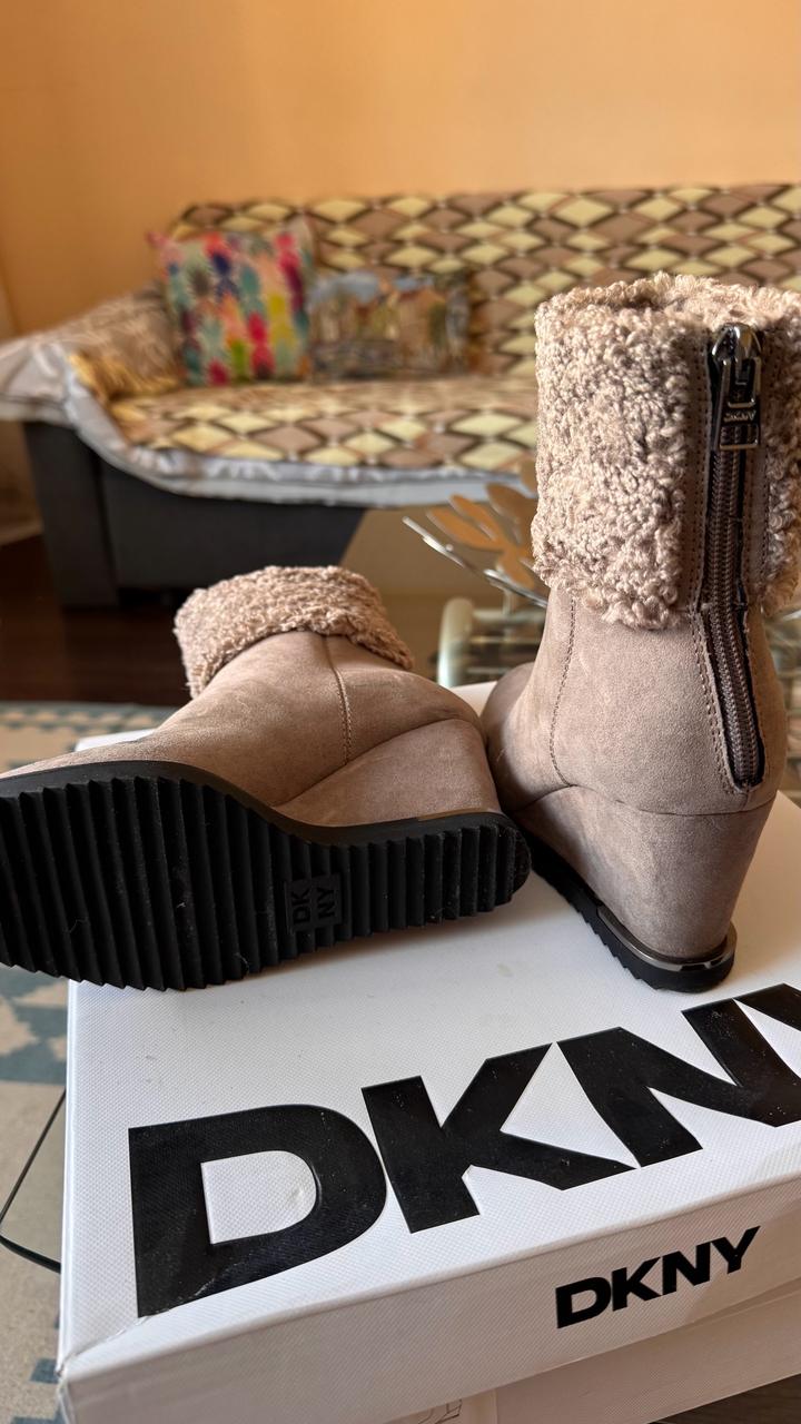 Ботильоны DKNY, оригинал 🤎 Размер: 35 Стильные и лёгкие , в бежево-тауповом цвете. Верх под замшу, мягкая плюшевая отделка. Удобная танкетка, устойчивая подошва. Застёжка-молния сзади. Состояние: отличное Очень комфортные и красиво смотрятся на ноге. Купили в США Артикул: 522338