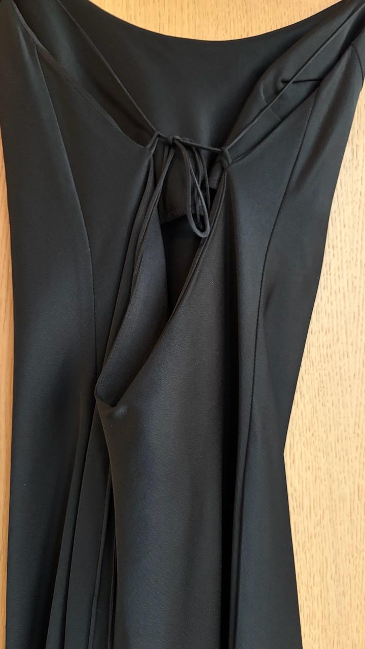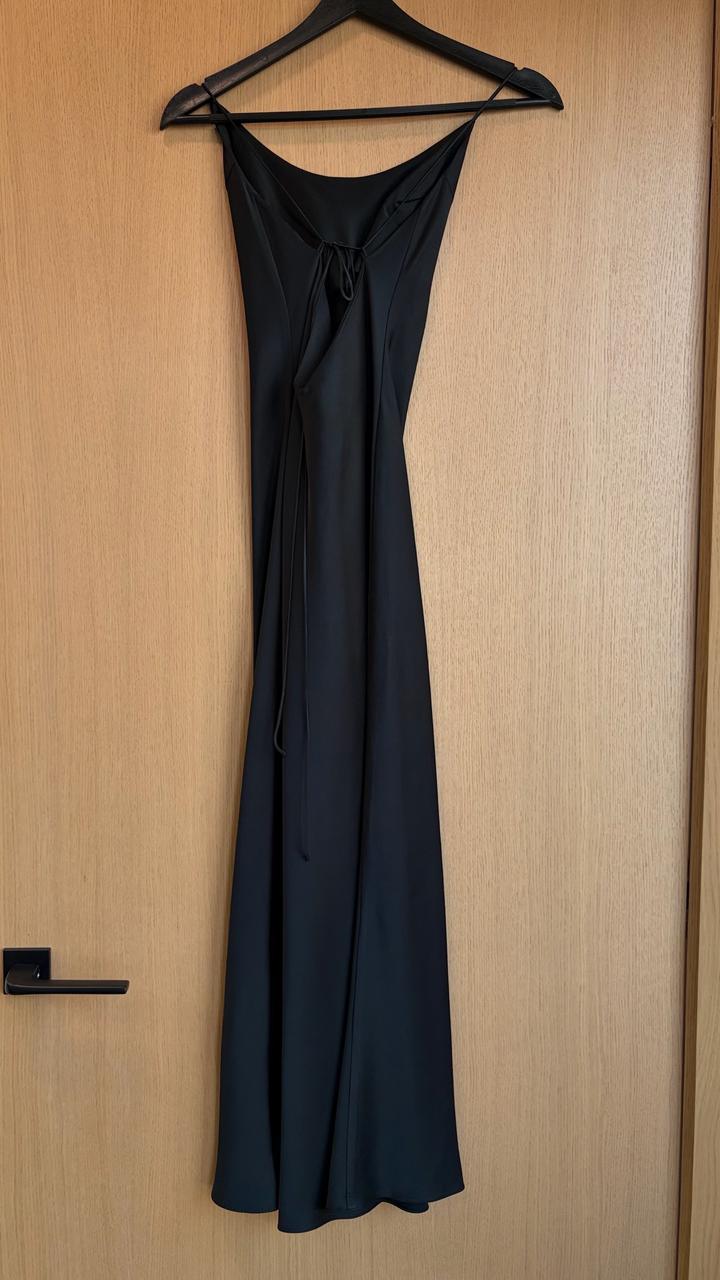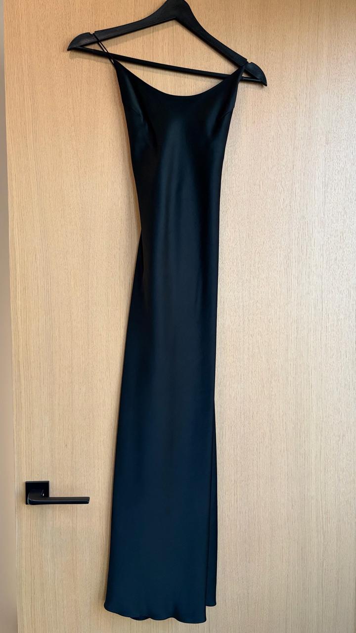 Чёрное шелковое платье в пол Элегантное длинное платье из 100% шёлка с мягким, струящимся силуэтом. Минималистичный крой с открытой линией плеч и тонкими бретелями подчёркивает фигуру. Открытая спина с завязками добавляет деликатный акцент и позволяет регулировать посадку. Ткань с лёгким матовым блеском красиво драпируется и движется при ходьбе. Идеально подойдёт для вечерних выходов, отпусков или минималистичных образов. Есть нюансы - мелкие зацепки Артикул: 522740