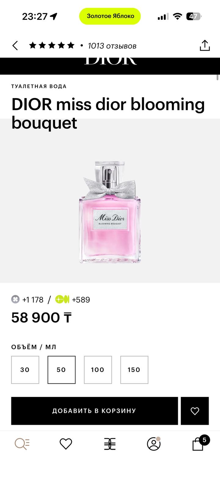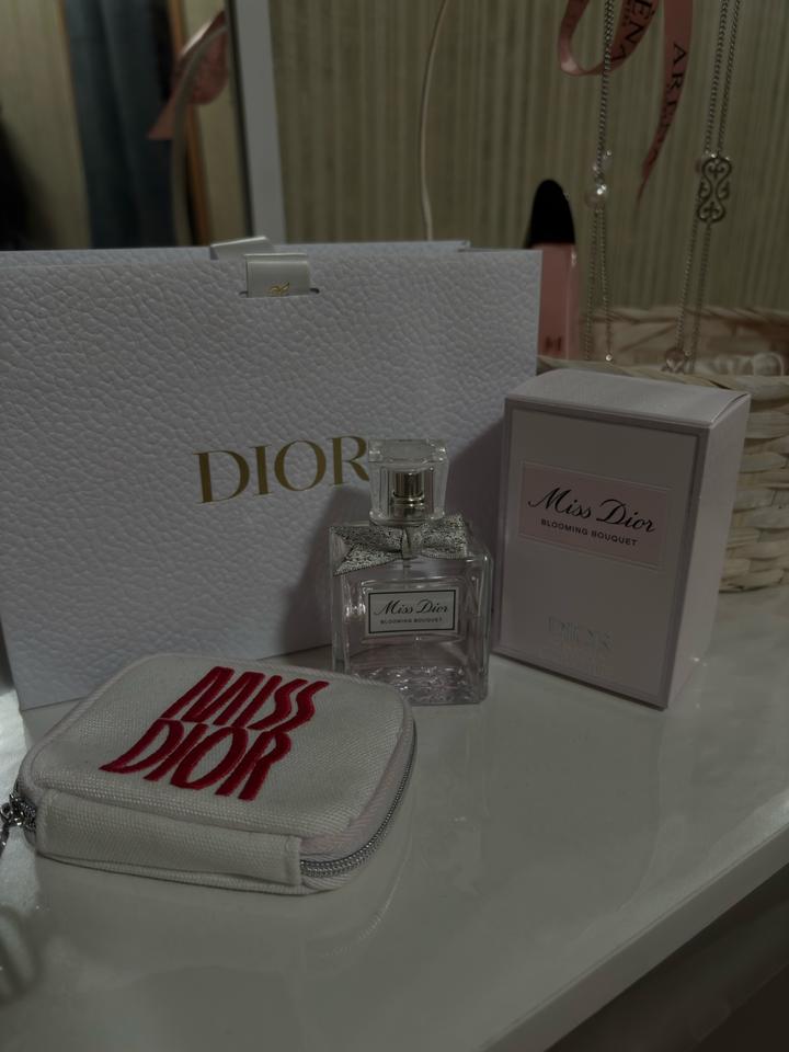 Miss Dior blooming bouquet 50 мл флакон, осталось примерно 35 мл В наборе есть коробочка и пакетик В подарок идет мини косметичка Артикул: 523786