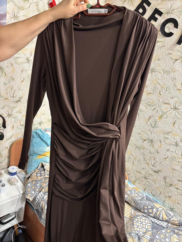Длинное шоколадное платье, надевалось один раз, состояние новое. Ткань плотный трикотаж, тянется, не просвечивает, Подойдет на размеры 50-56. Есть подплечники, рукава с вырезов для пальчика Длина рукава 63см Ширина плеч 47см Длина платья 140см Артикул: 523871