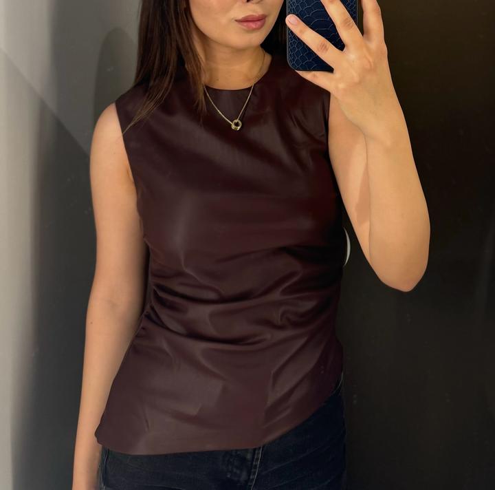 Бордовый очень красивый топ из мягкий эко кожи. Размер С. Носилась пару раз, состояние идеальное Артикул: 524325