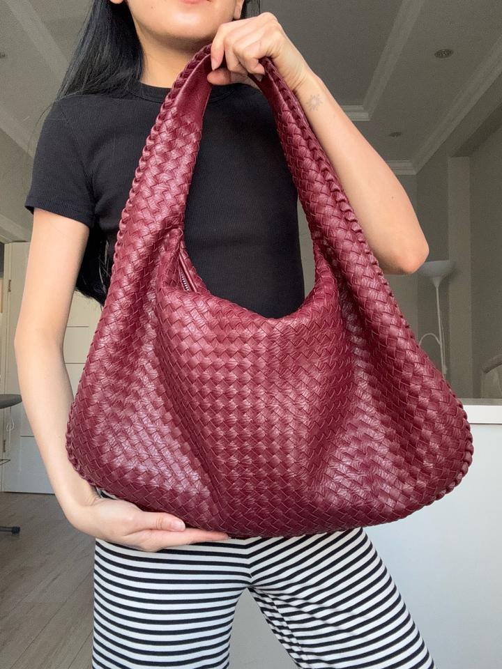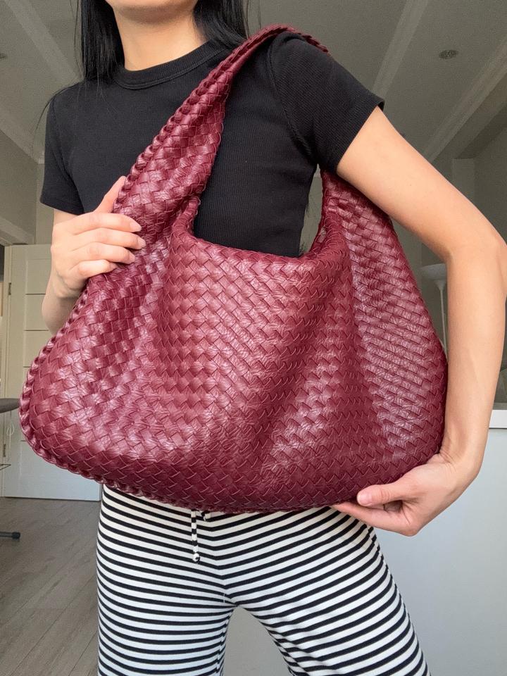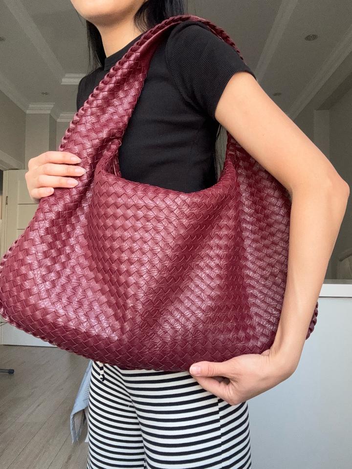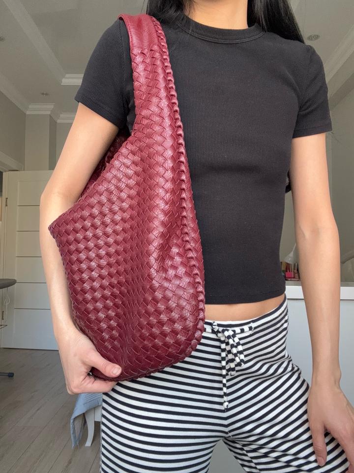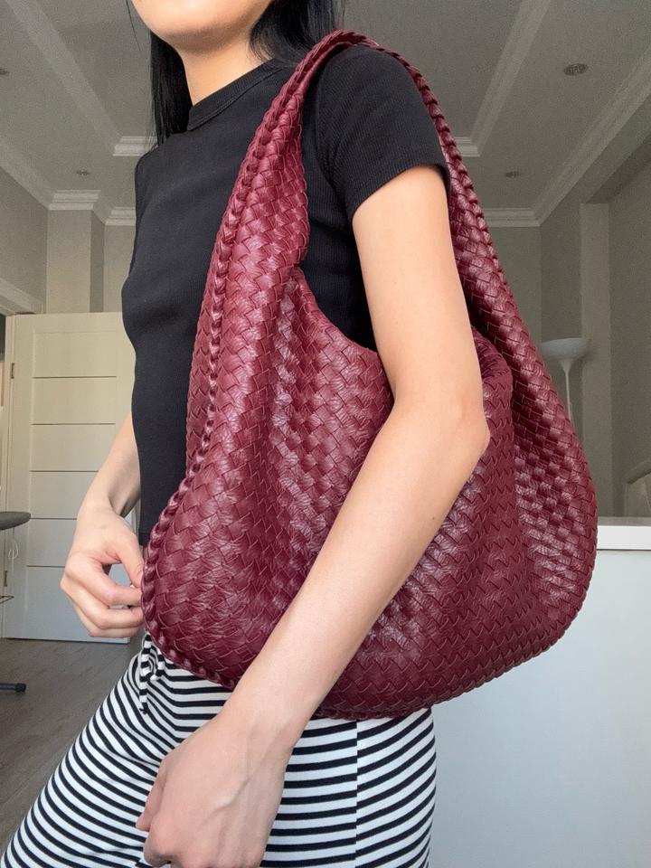 Стильная сумка-хобо насыщенного бордового оттенка с плетёной фактурой из натуральной кожи. Модель мягкой формы, вместительная и удобная в носке, красиво смотрится на плече. Состояние отличное. Шведский бренд Design by Si. Артикул: 524423