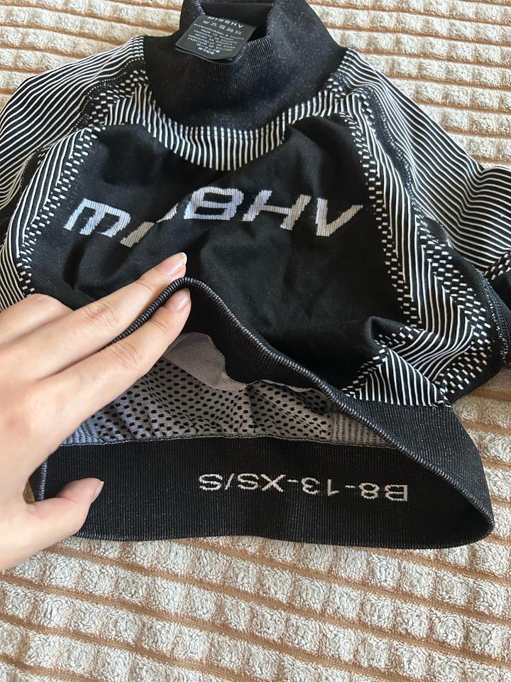 MISBHV SPORT. Чёрно-белый укороченный лонгслив, выполненный из облегающего, дышащего, экологичного трикотажа с инженерной структурой. Логотип спереди. Из-за особенностей используемой пряжи изделие может иметь неоднородный оттенок (меланж) Состав: 55% переработанный полиамид, 40% полиэстер, 5% эластан. Произведено в ЕС с использованием зелёной энергии и переработанных материалов. Изделие изготовлено в Польше с использованием 60% энергии от солнечных панелей. Артикул: 524625
