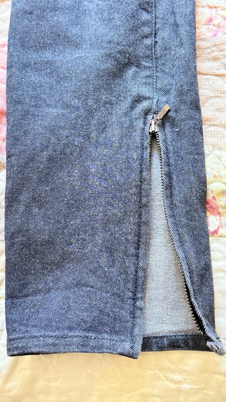 Черные джинсы, у подола молния, можно расстегнуть молнию у подола джинсы будут как клеш или застегнуть, как классика. Высокая посадка. Впереди на бедрах есть потертости. Артикул: 524671