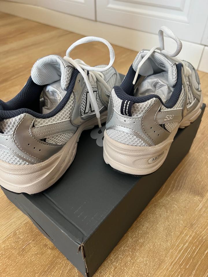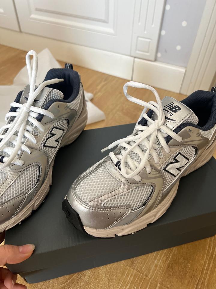 Кроссовки New Balance 530, в расцветке White & Silver Navy. ОРИГИНАЛ. Мне не подошел размер на пол размера. Измерьте стопу, кроссы 240 мм , на стопу 235 мм будет идеально. Я взяла впритык к сожалению. Цену не спускаю ниже 52 К. Не предлагать. Покупала для себя за эту цену. Нахожусь пока в Астане , буду в Алматы. Артикул: 524701