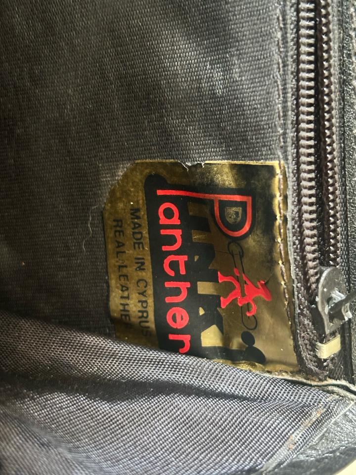 Винтажная, кожанная сумка, Бренда Pink Panther. Made in Cyprus. Внутри карман на замке, сумка на длинном (не регулирующем) ремне. Закрывается на магнитном замке. Артикул: 524931