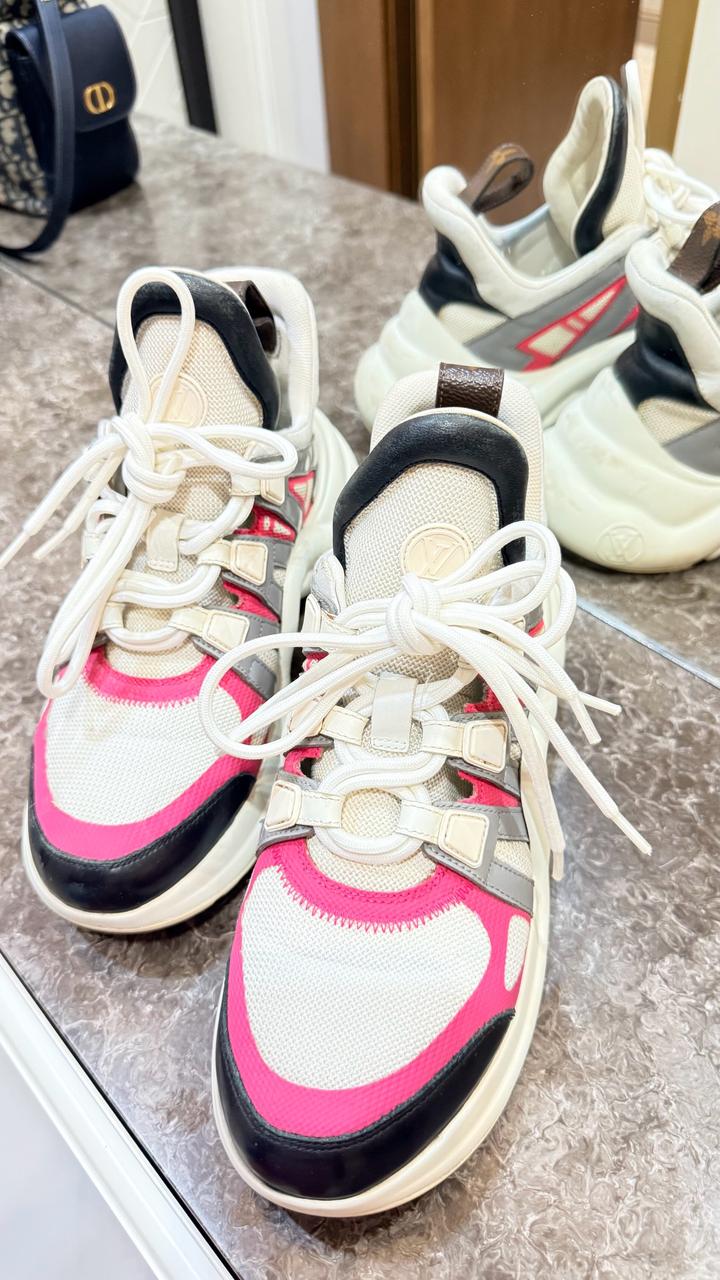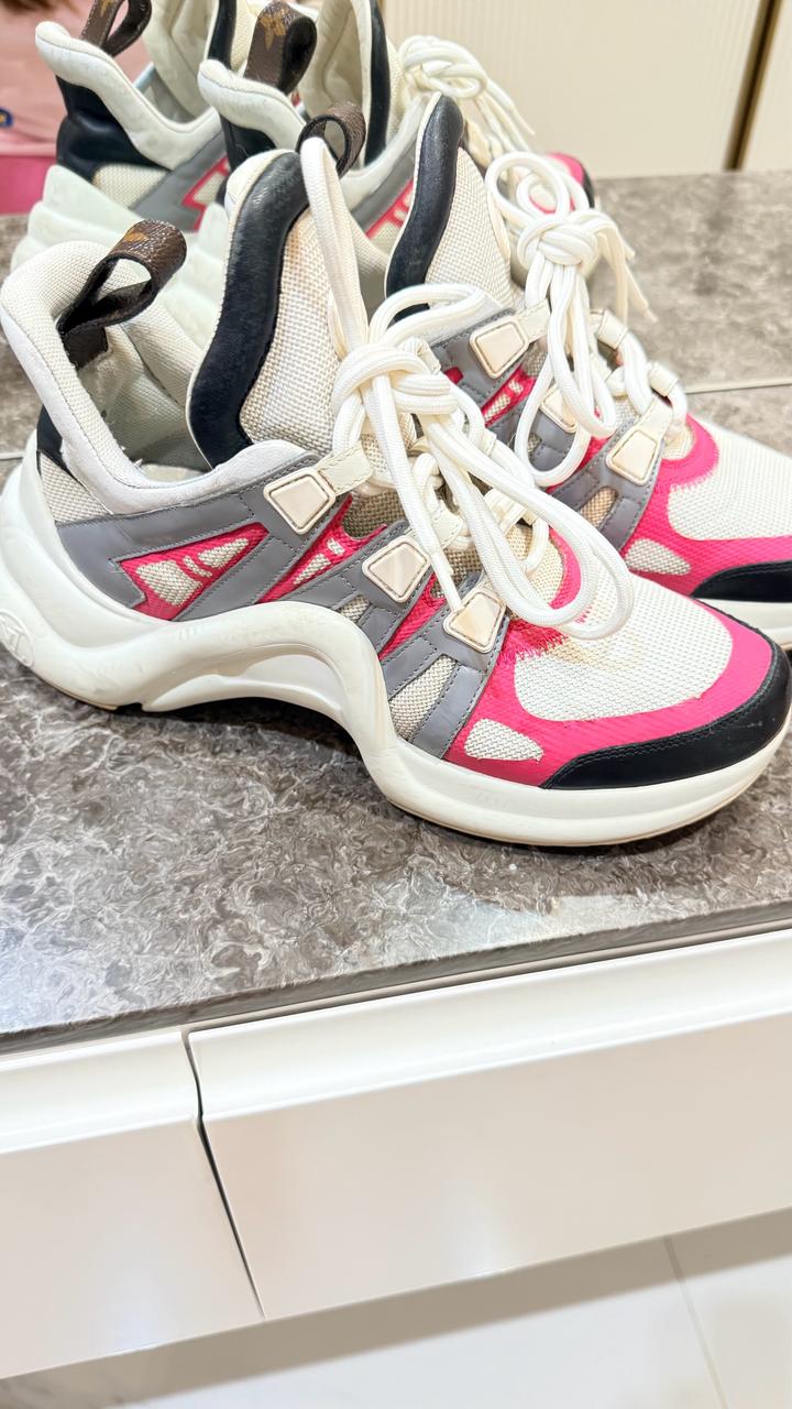 Оригинальные кроссовки Louis Vuitton в стильном спортивном дизайне. Очень эффектное сочетание цветов: бежевый, серый и яркий розовый — выглядят дорого и сразу привлекают внимание ✨ Удобная массивная подошва, лёгкие и комфортные — отлично подойдут на каждый день и под стильные образы. Состояние: отличное, аккуратно носились, после профессиональной чистки. Причина продажи: после беременности немного вырос размер ноги, стали малы. 💫 Идеальный вариант брендовой обуви по приятной цене. Артикул: 525291