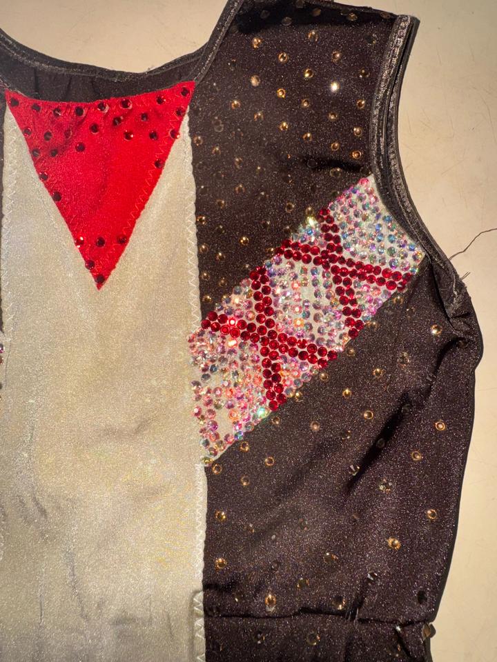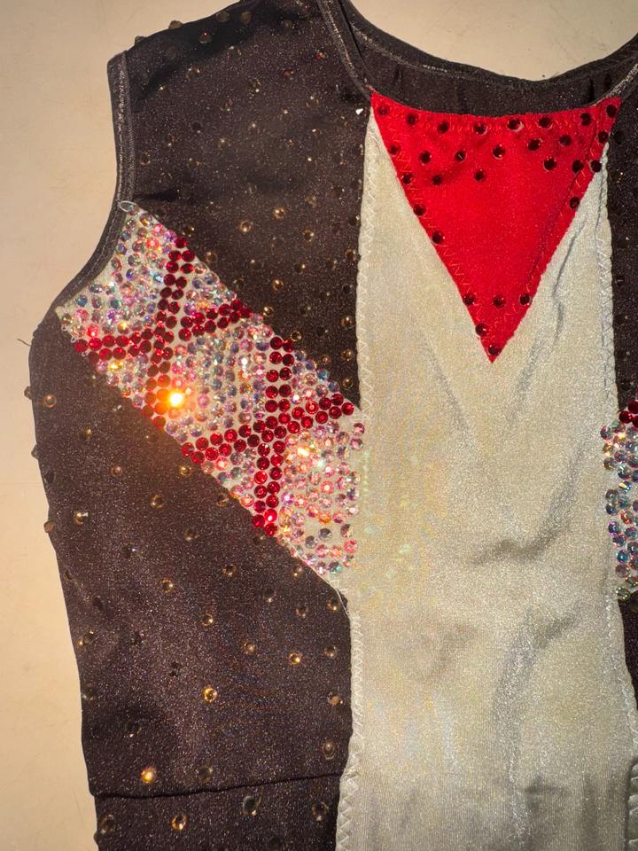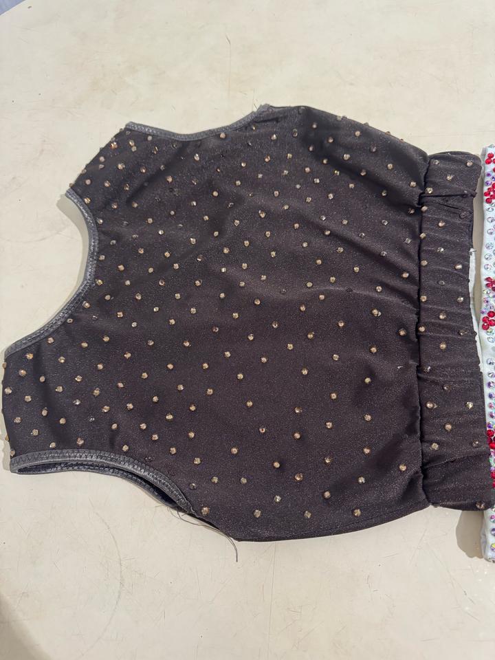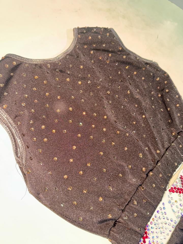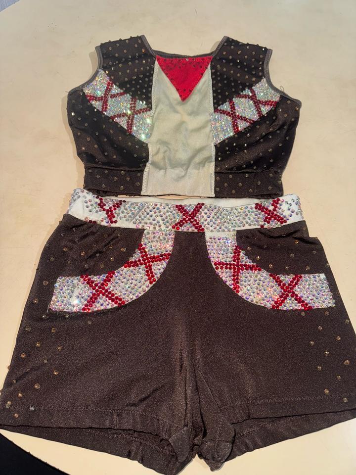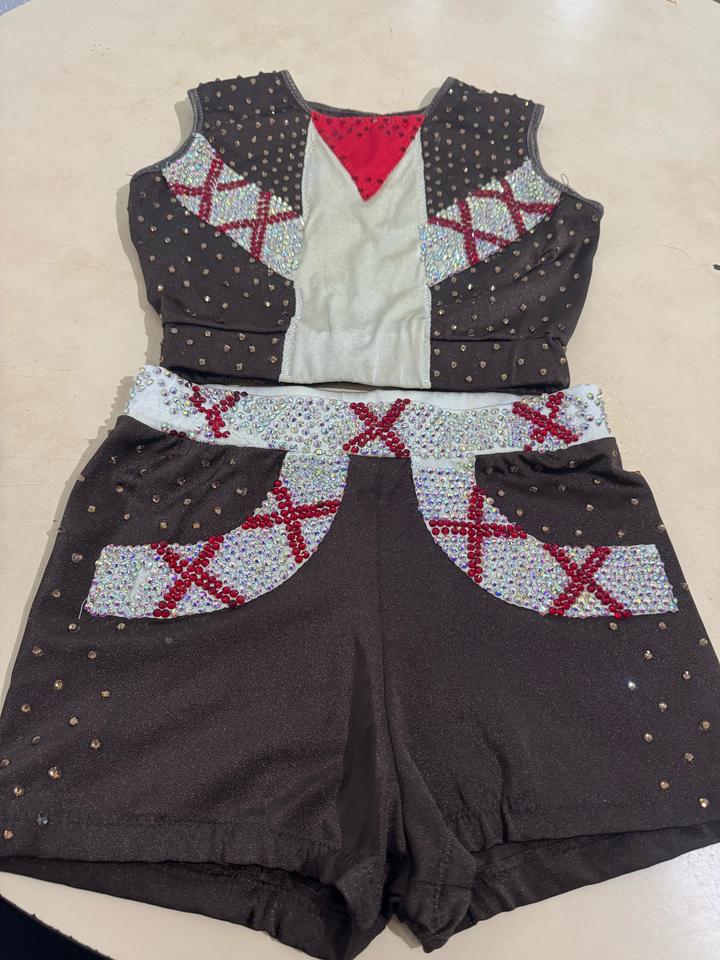костюм для танцев или чирлидинга, состоящий из топа и шорт, украшенный стразами сшиты на заказ. На фотке видно спереди белая ткань при стирке стало чуть коричневым. Камешки на месте. Артикул: 525354
