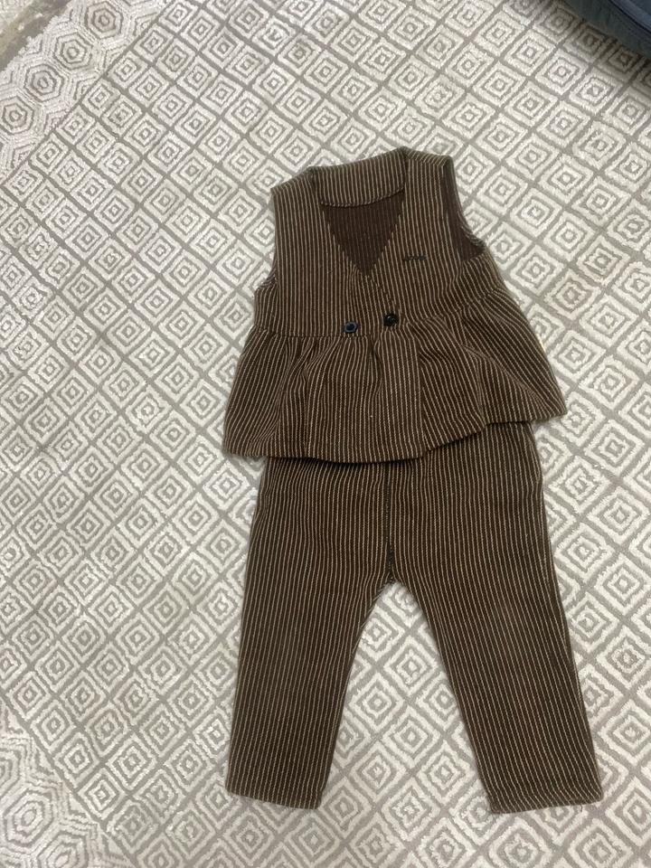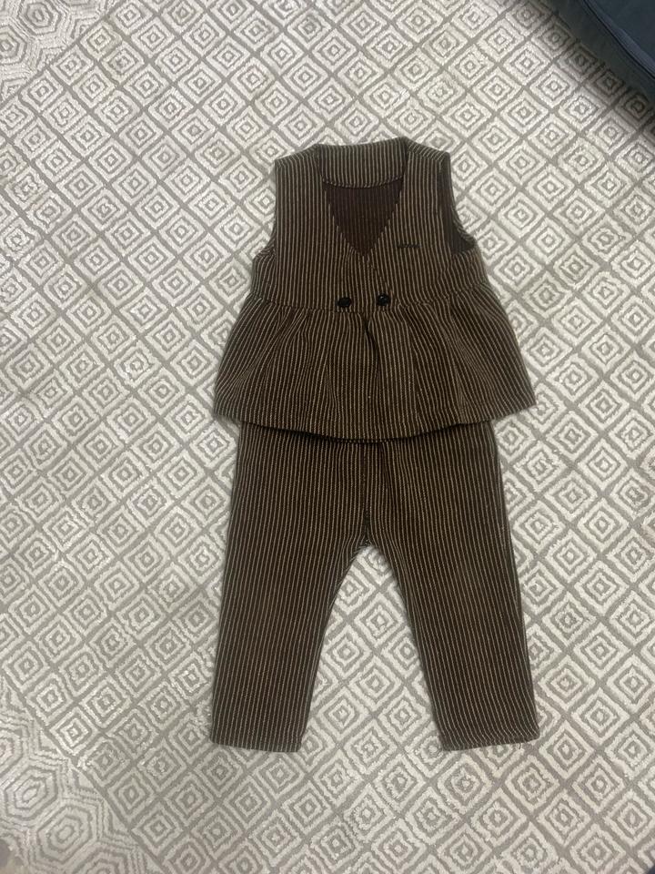 Стильный костюм для девочек. В отличном состоянии. Жилетка и штаны, штаны широкие расчитаны на подгузник. Ткань плотная, весной хорошо носить с колготками. Пуговицы рабочие. Артикул: 525408