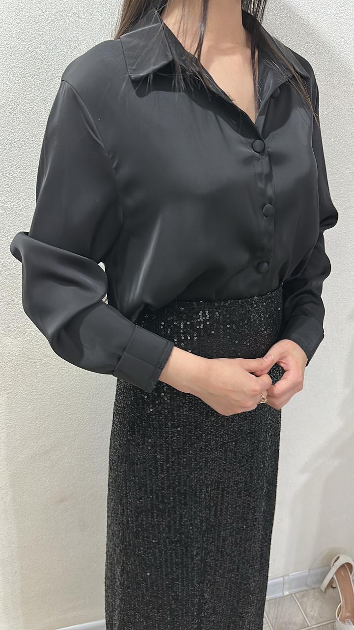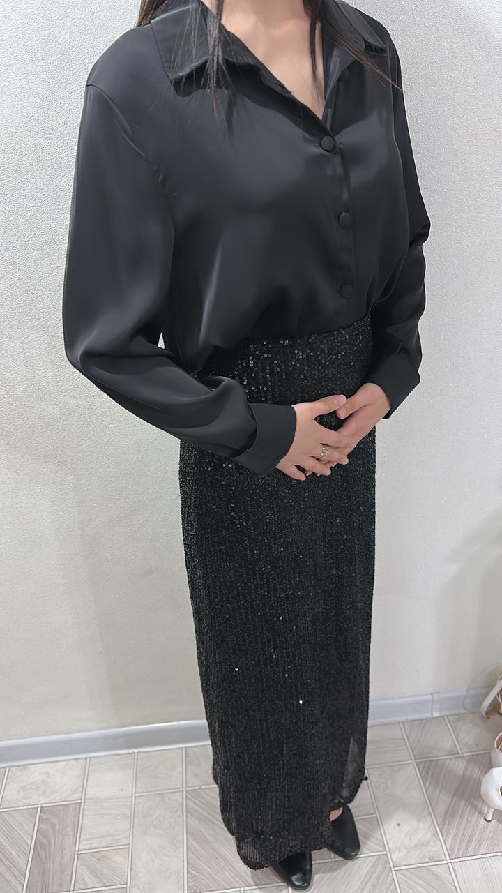 Черная юбка с пайетками и черная рубашка атласM