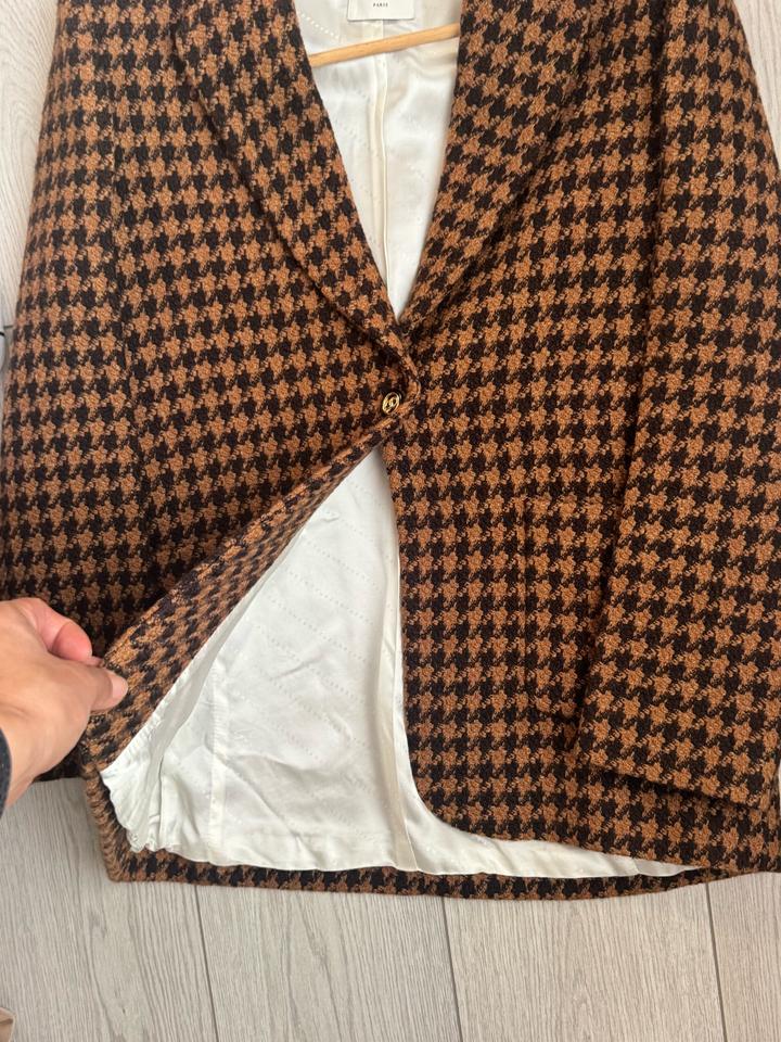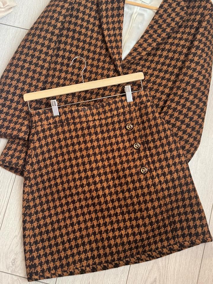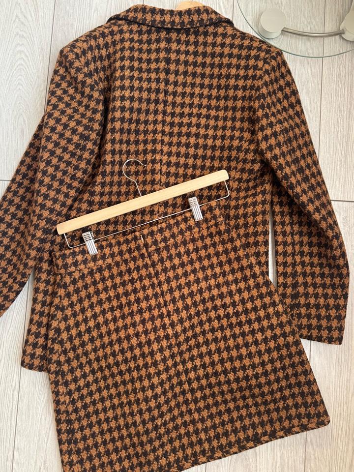 Элегантный комплект в трендовом принте «гусиная лапка» в тёплых кофейно-шоколадных оттенках. Пиджак (размер FR 38) с аккуратным кроем и юбка (размер 2) с декоративными пуговицами подчёркивают фигуру и создают дорогой, собранный образ. Посадка — подчёркивает талию Ткань плотная, держит форму Смотрится дорого и актуально Выкупала через байера из Европы. Размер пиджака 38, размер юбки 2 Артикул: 525982