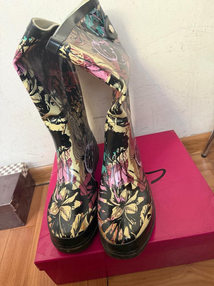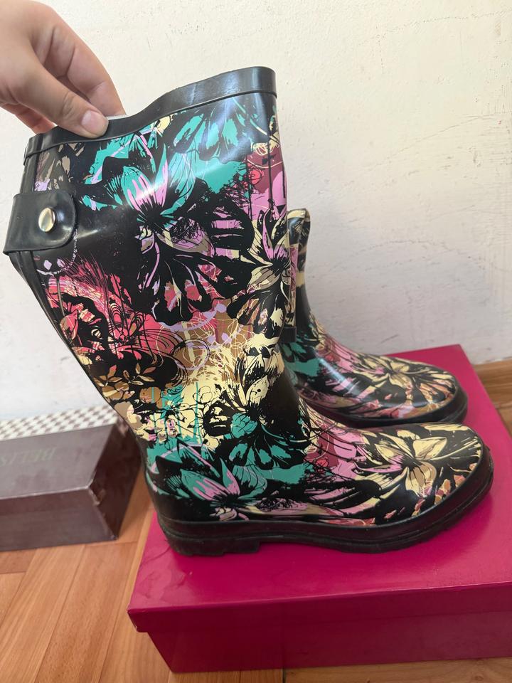 Надевались всего 1–2 раза. Черные резиновые сапоги с ярким цветочным принтом. Отлично подходят для дождливой погоды. Артикул: 527041