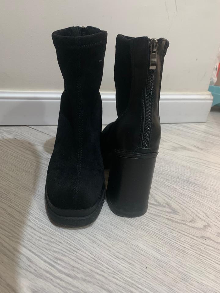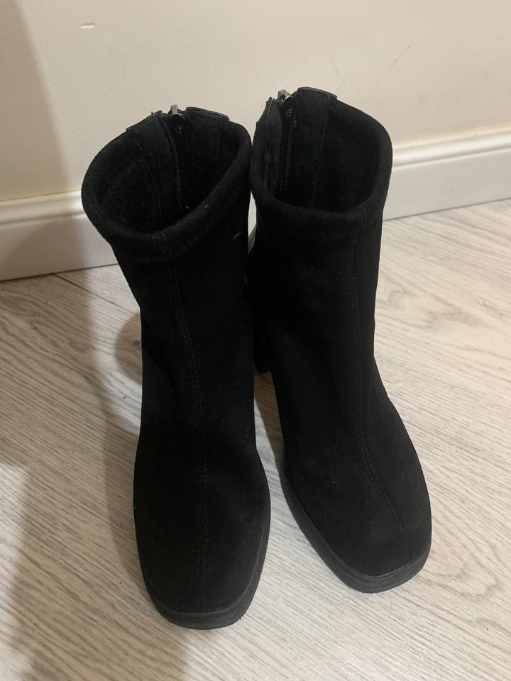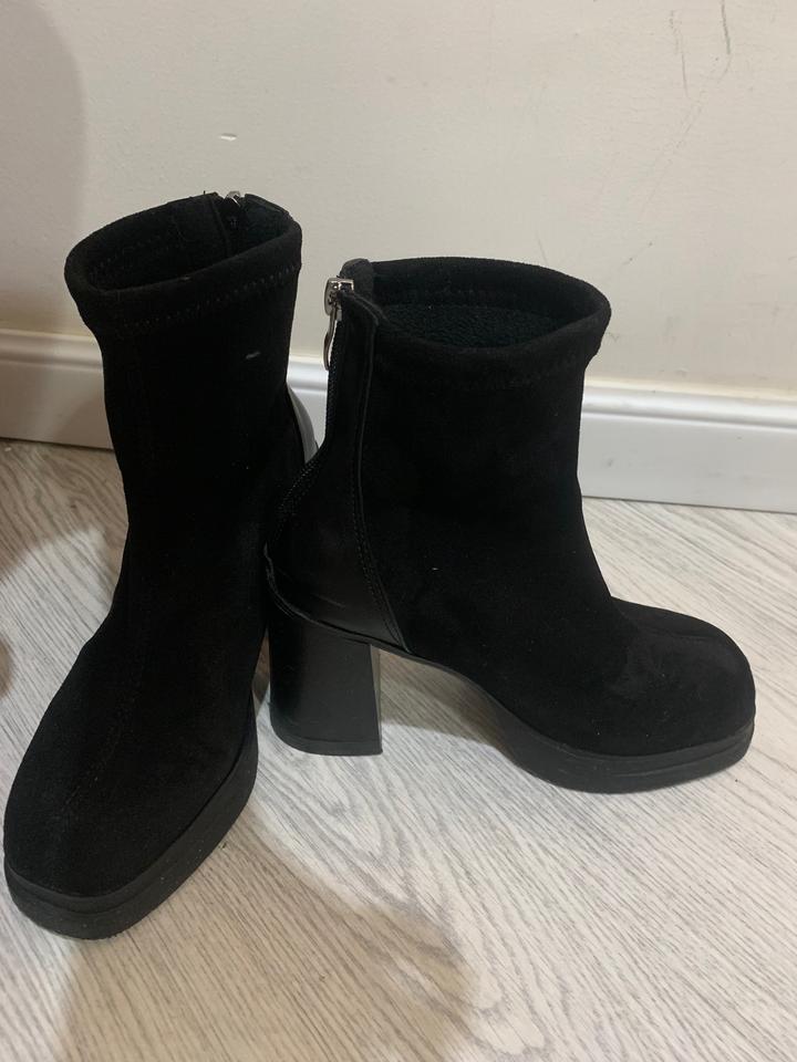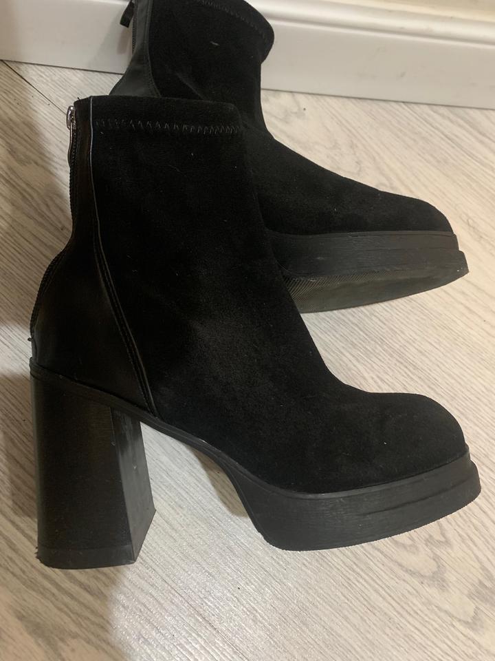 Ботильоны из искусственной замши, на толстом каблуке и платформе. Высота каблука 8,5 высота платформы 2 см. Очень удобные, но большие мне по размеру. Надела 1 раз. Артикул: 527054
