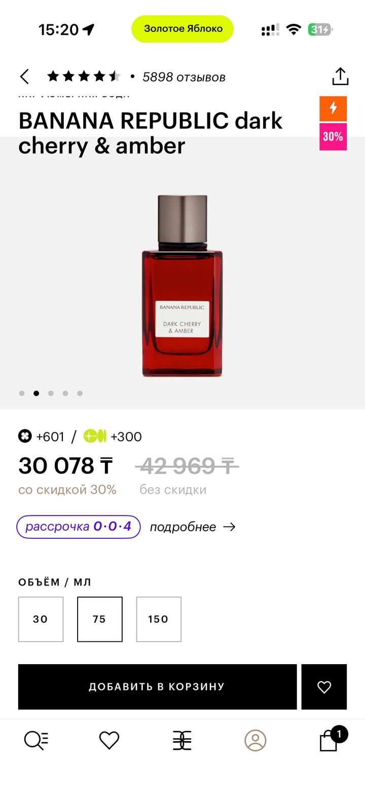 Покупала в Золотом Яблоке, оказался не мой аромат. Коробки нет, так как планировала пользоваться. Не хватает 10-15мл. Флакон 75мл. Артикул: 527271