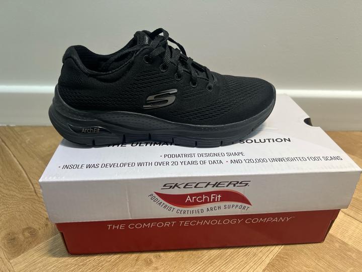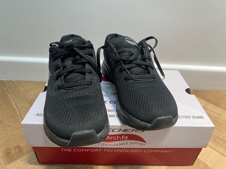 Стильные и комфортные женские кроссовки ArchFit от бренда SKECHERS (размер 36)отлично подойдут как для активного отдыха, так и для фитнеса. Бесшовный верх чёрного цвета выполнен из технологичного текстиля в виде воздухопроницаемой сетки. Использовались пару раз. Артикул: 527803