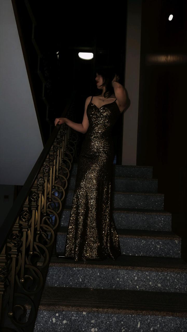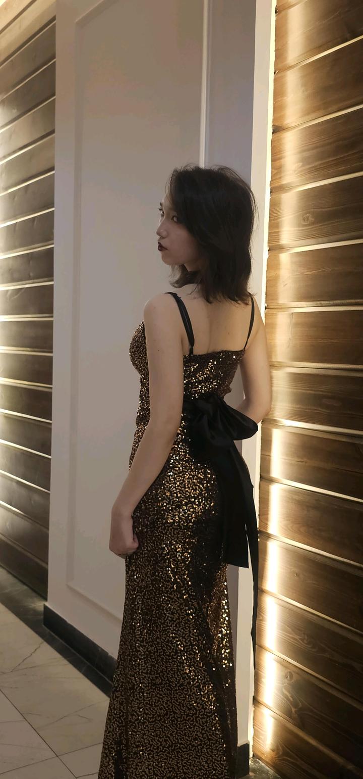 Золотое вечернее платье Размер S По бокам есть 2 ткани как лента блогадаря чему оно утягивает и платье выглядит красиво. На данной фотографии я завязала их виде бантики Носила 1 раз Артикул: 528857