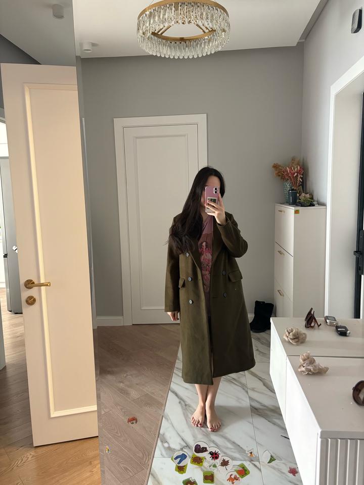Пальто насыщенного темно-оливкового цвета. Прямой крой. Есть карманы. Все прошито аккуратно, сидит на теле очень комфортно. Подойдет на S-M. Но пальто в целом прямое, не оверсайз, поэтому если по фигуре, то снизу объемный свитер может, допустим, не влезть. Если на XS-S, может и с кофтой теплой снизу можно носить. У меня размер М, рост 168. В составе 80% натуральной шерсти, 20% полиэстер. Ткань теплая, но из-за шерсти немного колючая, если на голую кожу. Писали, что не пропускает ветер. Подклад⛔️ Артикул: 529117