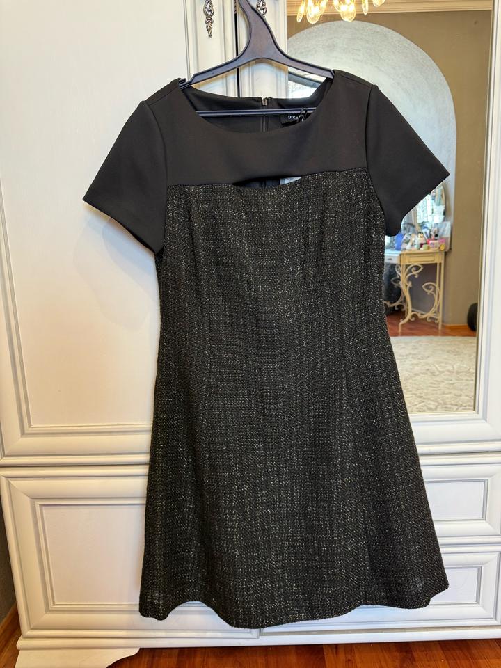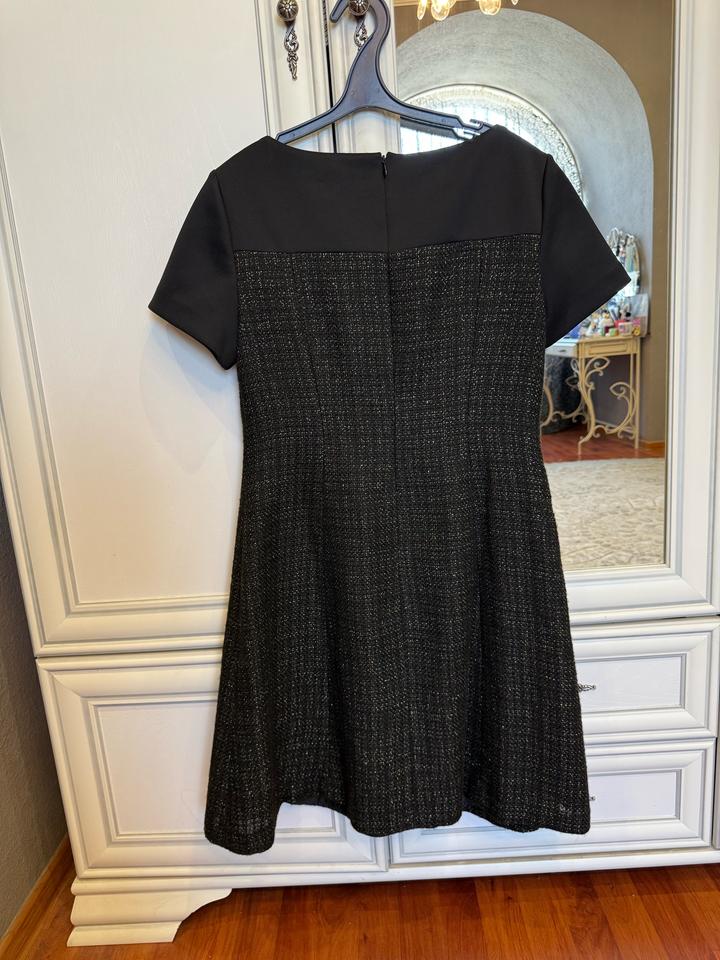 Черное платье из твида-букле с золотой нитью с коротким рукавом. Размер - 6 Артикул: 529260