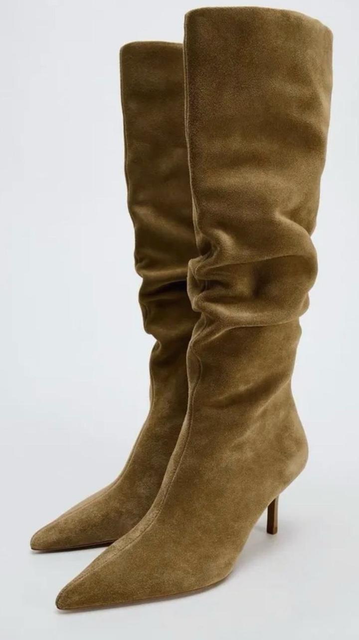Стильные замшевые сапоги до колена в элегантном бежево-оливковом оттенке. Модель с заострённым носком и аккуратным каблуком, красиво сидят по ноге и создают эффектную складку по голенищу. Идеально подойдут для стильных повседневных и вечерних образов Артикул: 529380