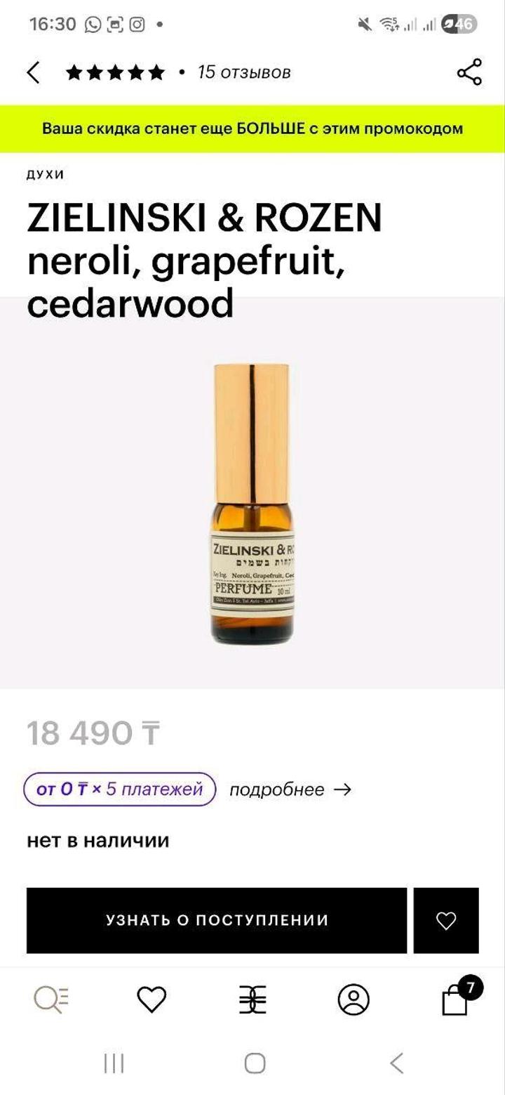 ZIELINSKI & ROZEN neroli, grapefruit cedarwood без 1 распыления, не подошёл аромат Артикул: 529536