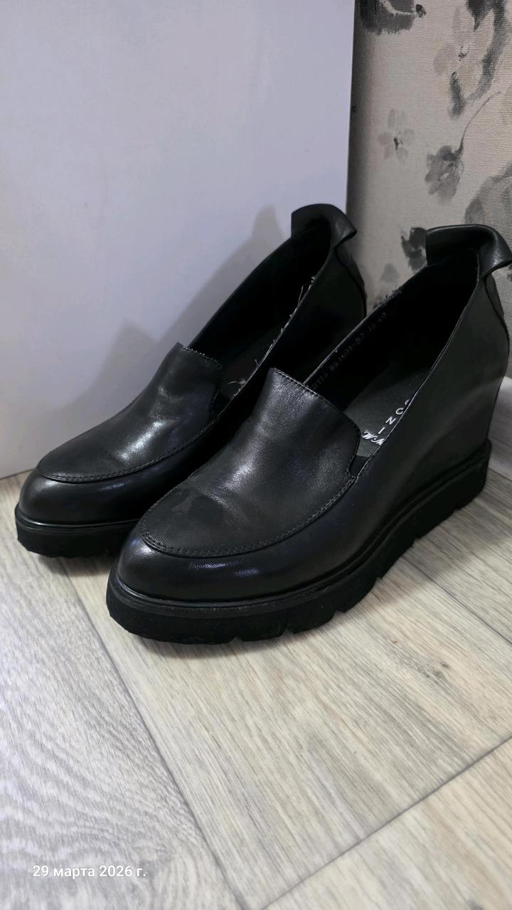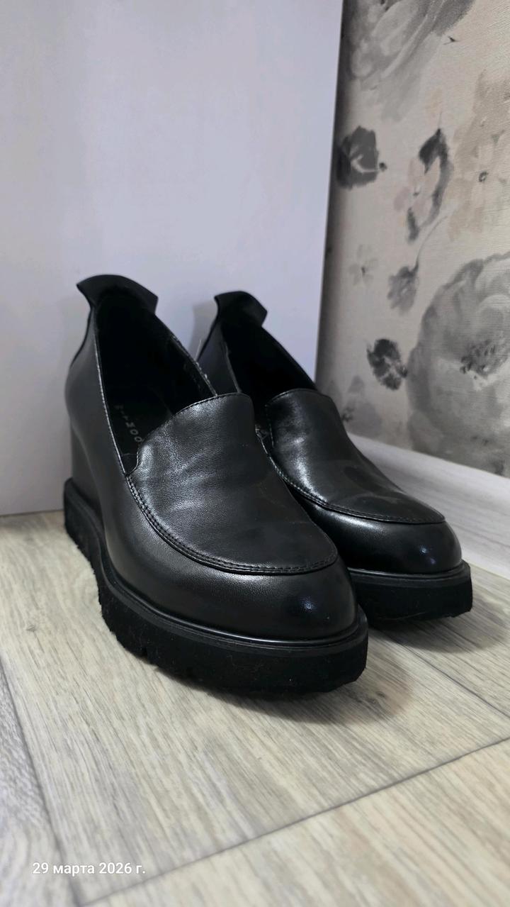 Продам стильные и невероятно удобные туфли-лоферы черного цвета. Выполнены из качественной мягкой кожи. Модель на комфортной танкетке с тракторной подошвой — отличный вариант для тех, кто хочет прибавить в росте, не теряя в удобстве Артикул: 529574