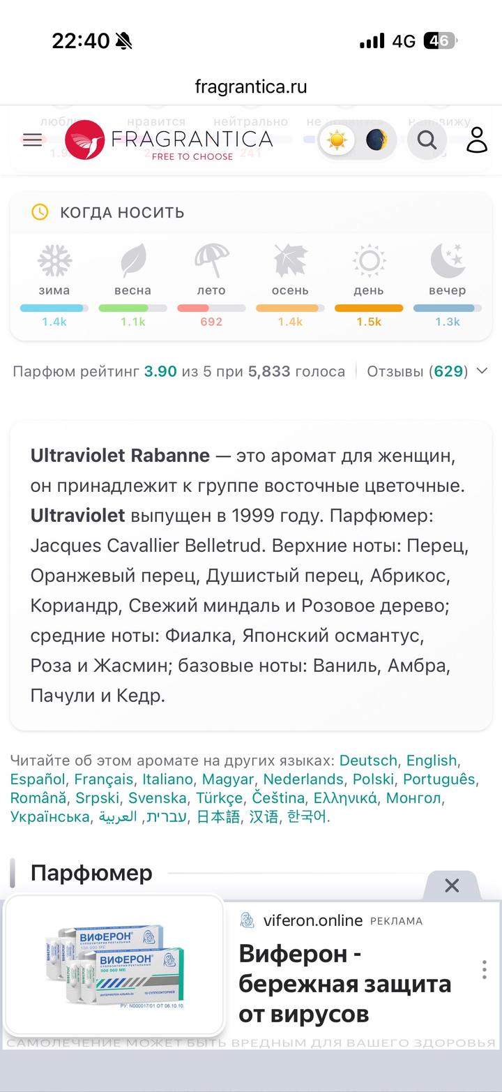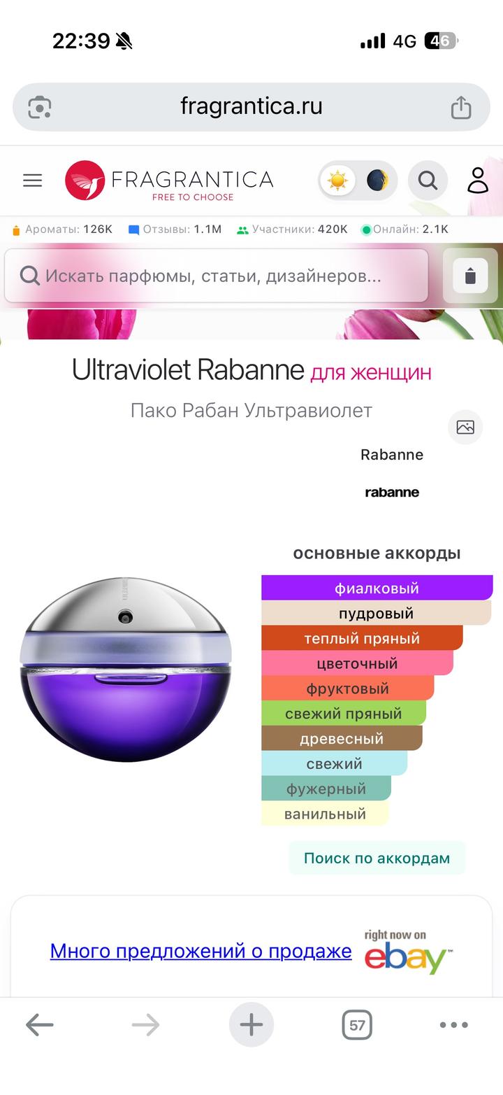 Парфюм от 80 мл в концентрации о де парфам. Ultraviolet Rabanne — это аромат для женщин, он принадлежит к группе восточные цветочные. Ultraviolet выпущен в 1999 году. Парфюмер: Jacques Cavallier Belletrud. Верхние ноты: Перец, Оранжевый перец, Душистый перец, Абрикос, Кориандр, Свежий миндаль и Розовое дерево; средние ноты: Фиалка, Японский османтус, Роза и Жасмин; базовые ноты: Ваниль, Амбра, Пачули и Кедр. Артикул: 529673