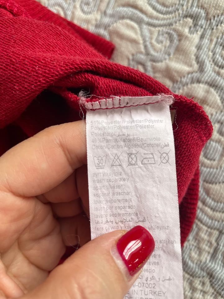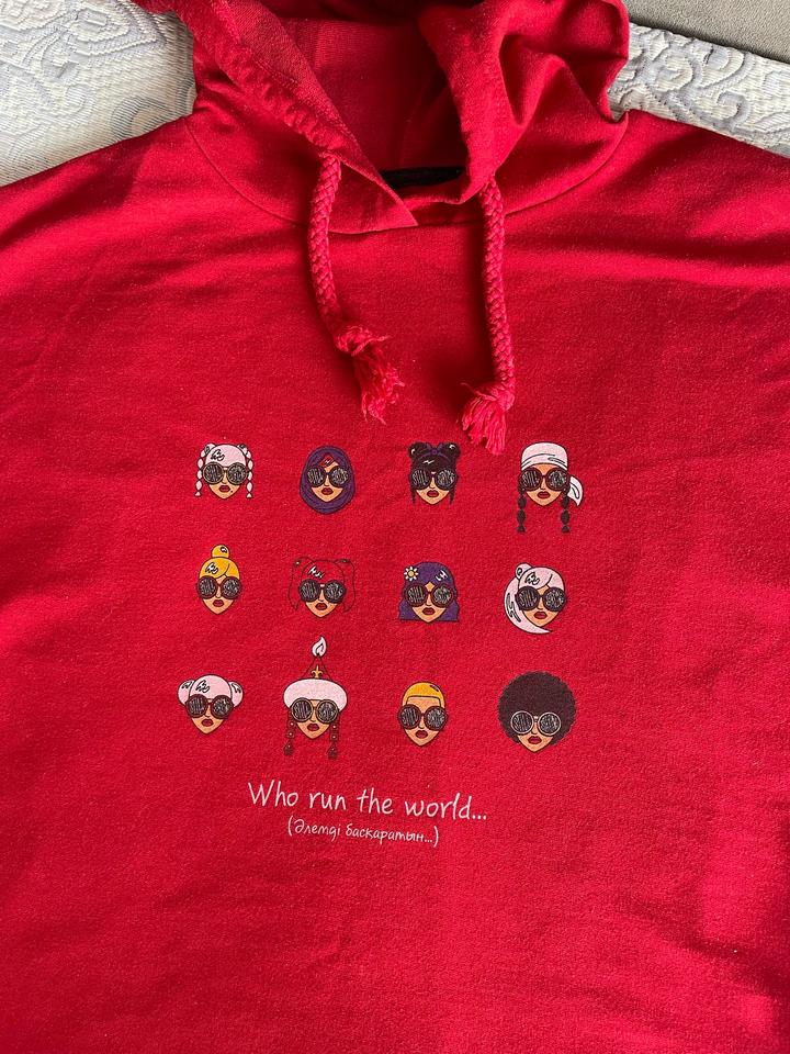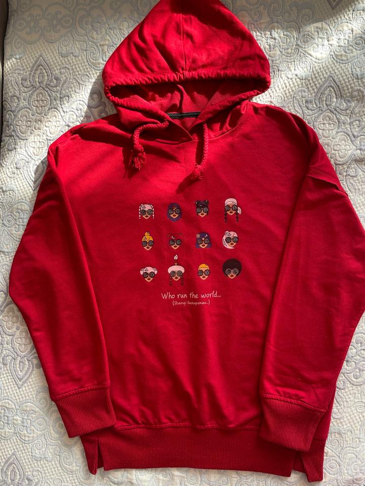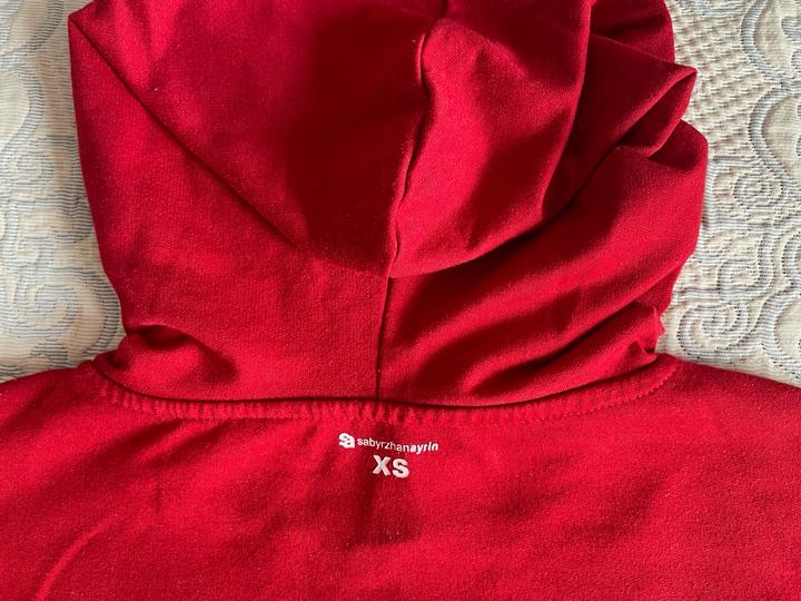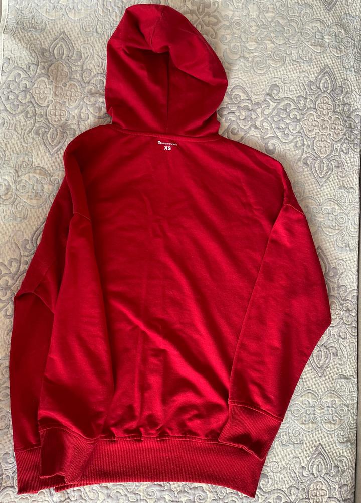 Насыщенно красный женский худи от бренда Sabyrzhanayrin с оригинальным принтом спереди. Идеален на повседневную носку. Размер худи XS, но подойдет на S / M, так как немного большемерит. Артикул: 529807
